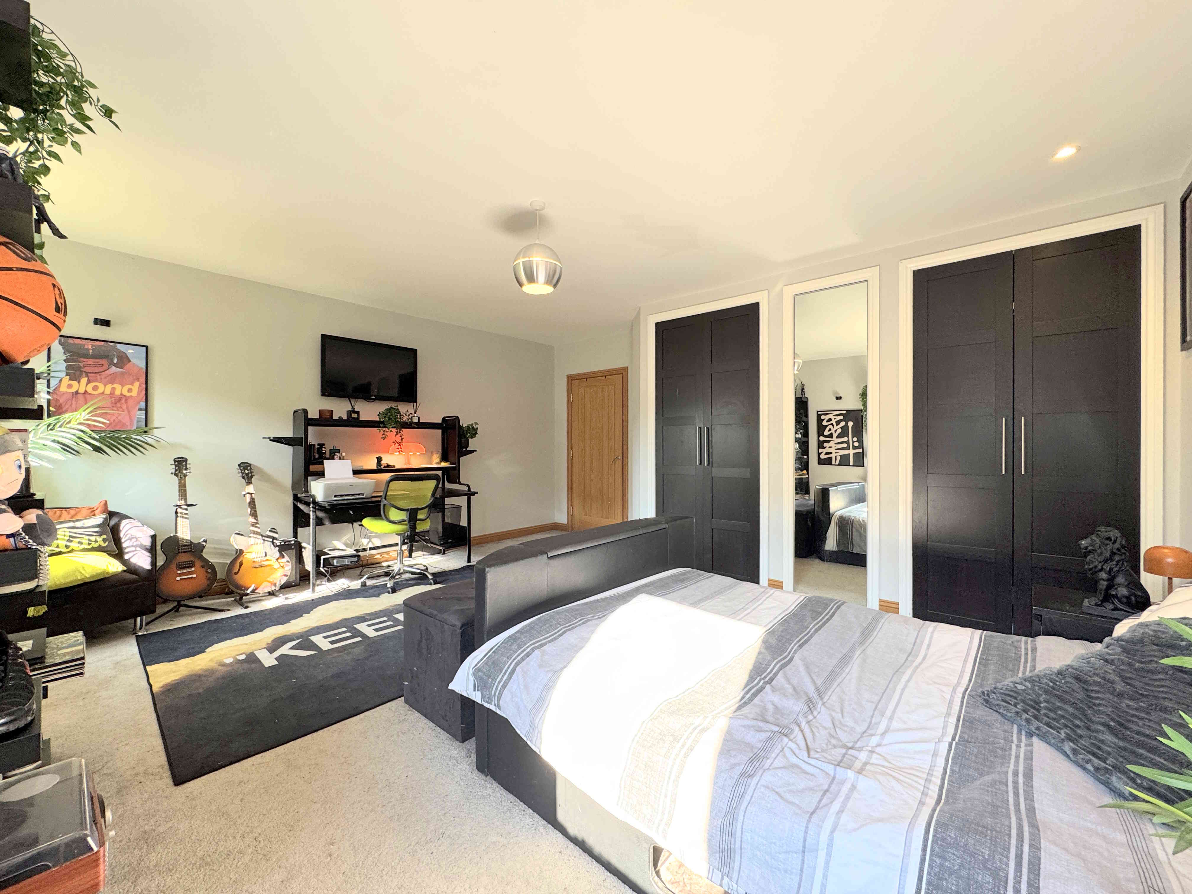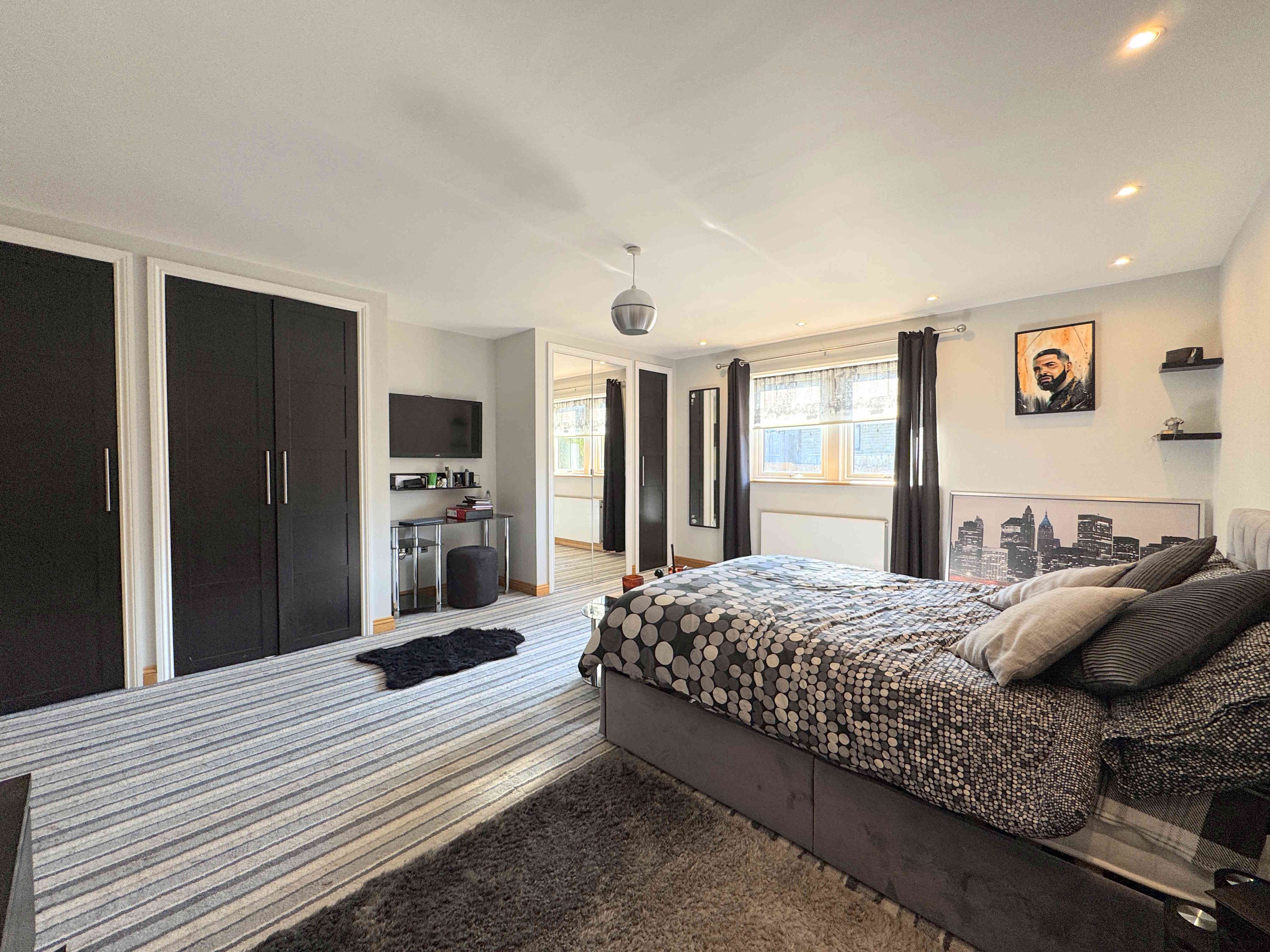 A generously sized double bedroom, featuring fitted wardrobes, ceiling spotlights, a radiator, and UPVC windows.