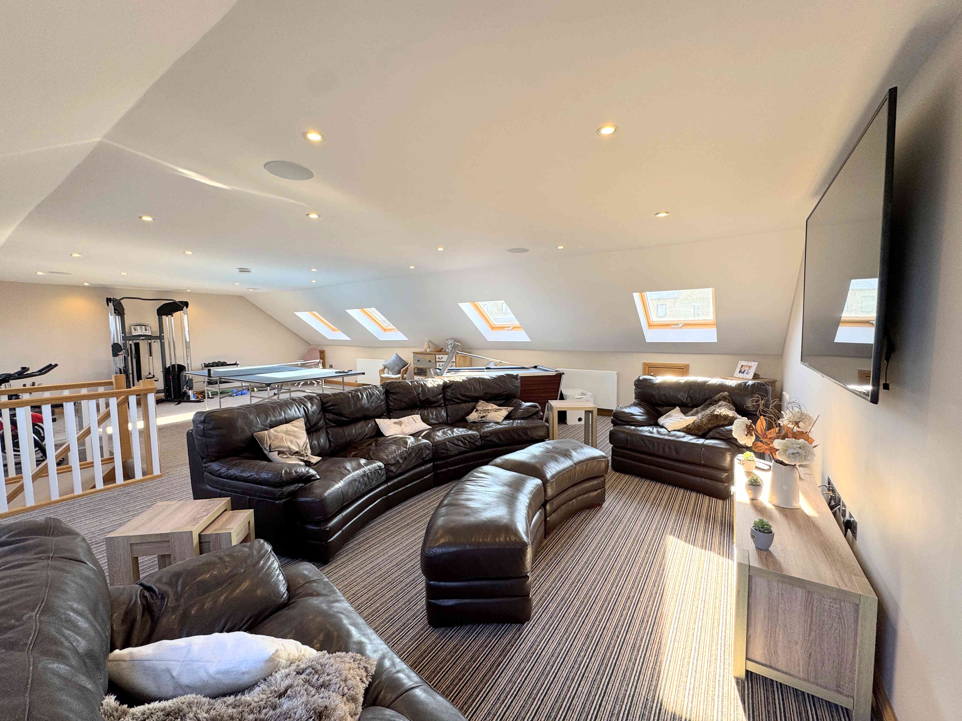 A versatile space, accessed via stairs with built-in lighting, currently used as a games room but offering potential to be converted into a generous master suite or self-contained granny flat. Features include ceiling spotlights, an integrated Sonos sound system, under-eave storage, radiators, and Velux windows.