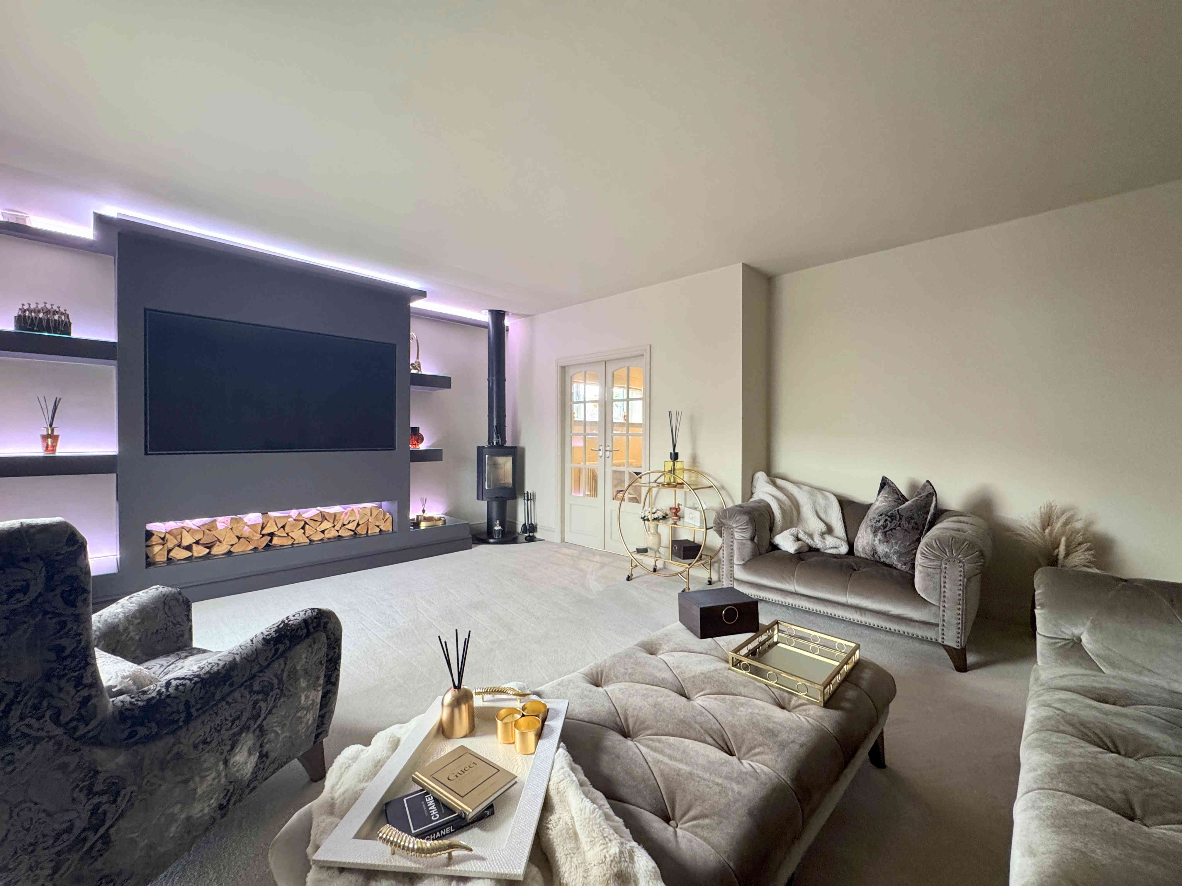 A spacious lounge boasting a media wall and a multi-fuel stove, with ample natural light and warmth provided by a radiator.