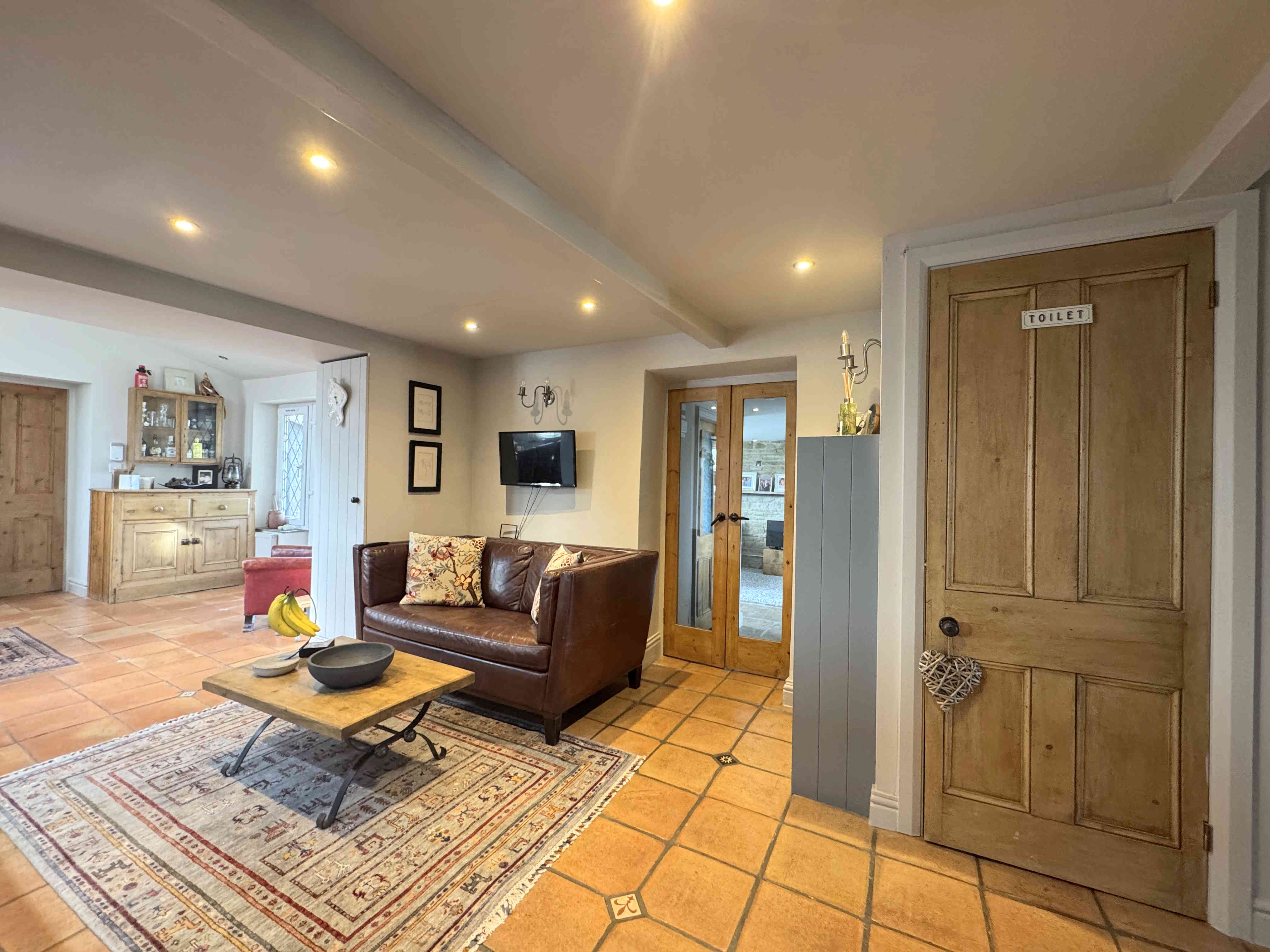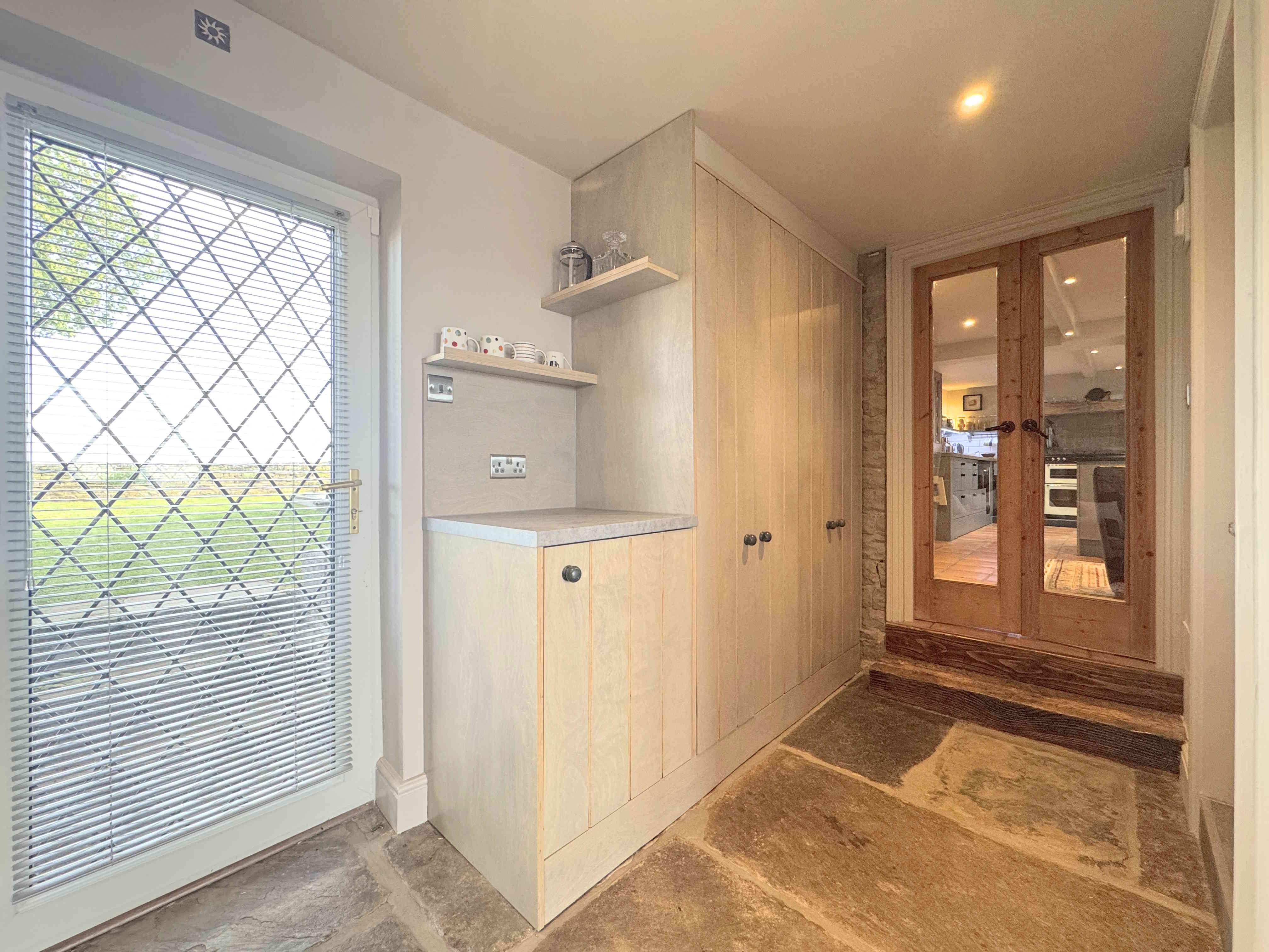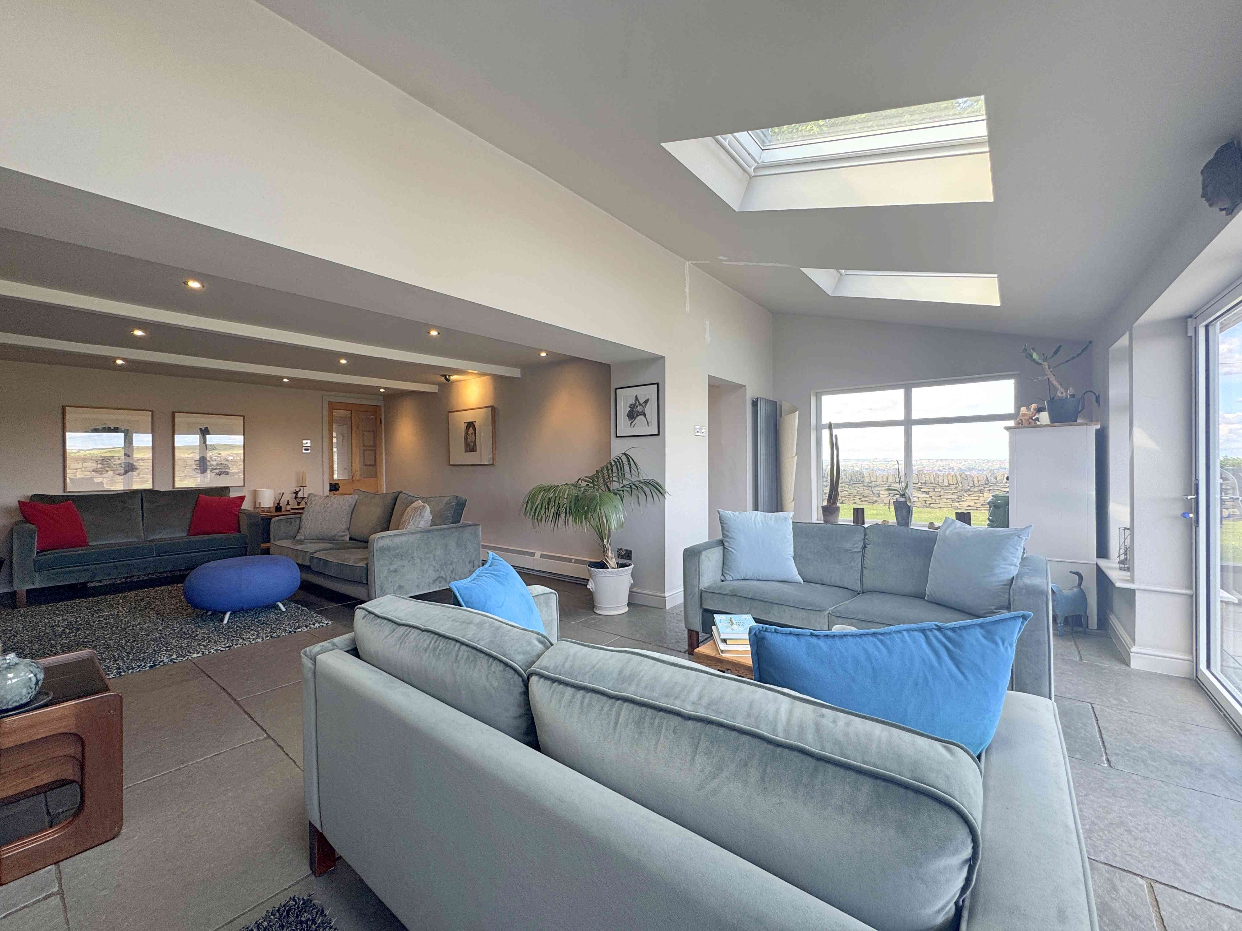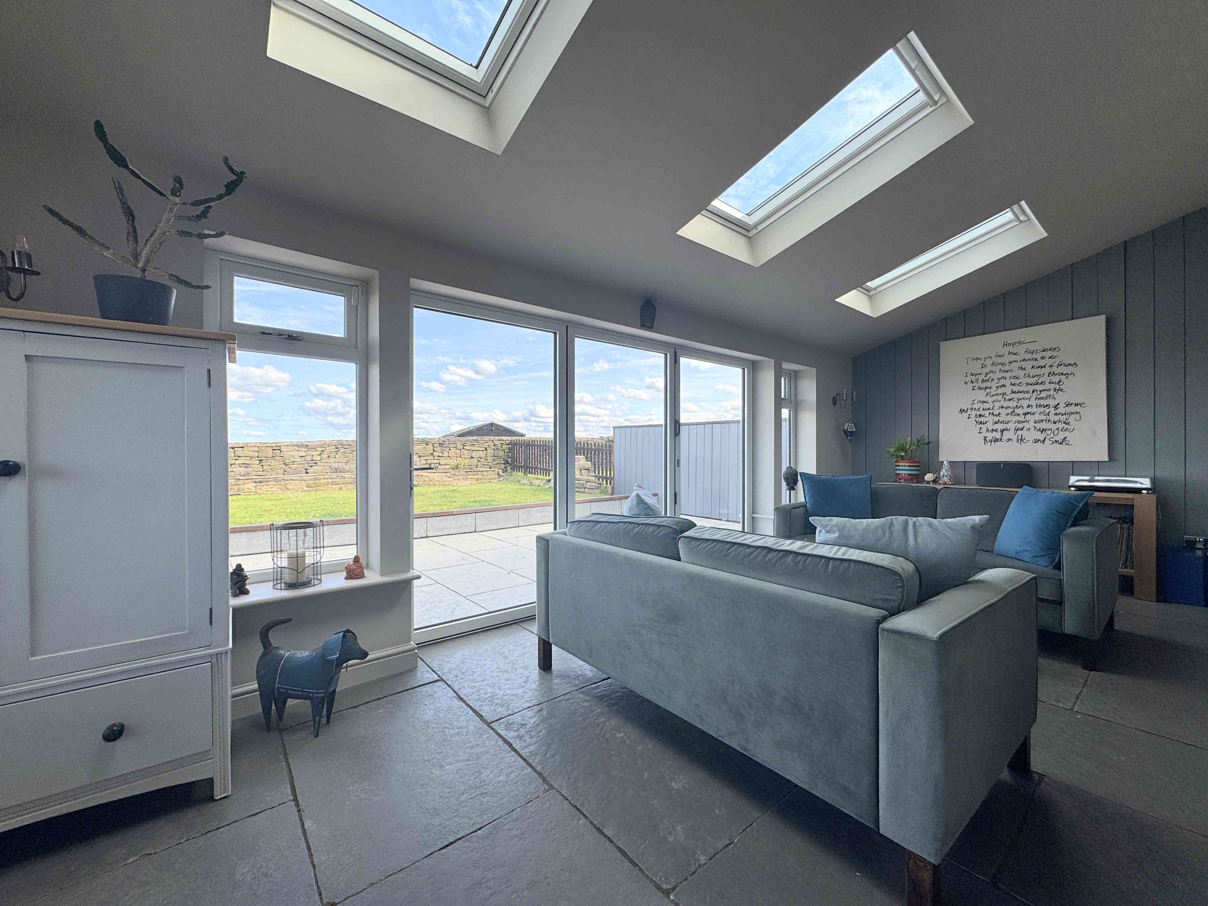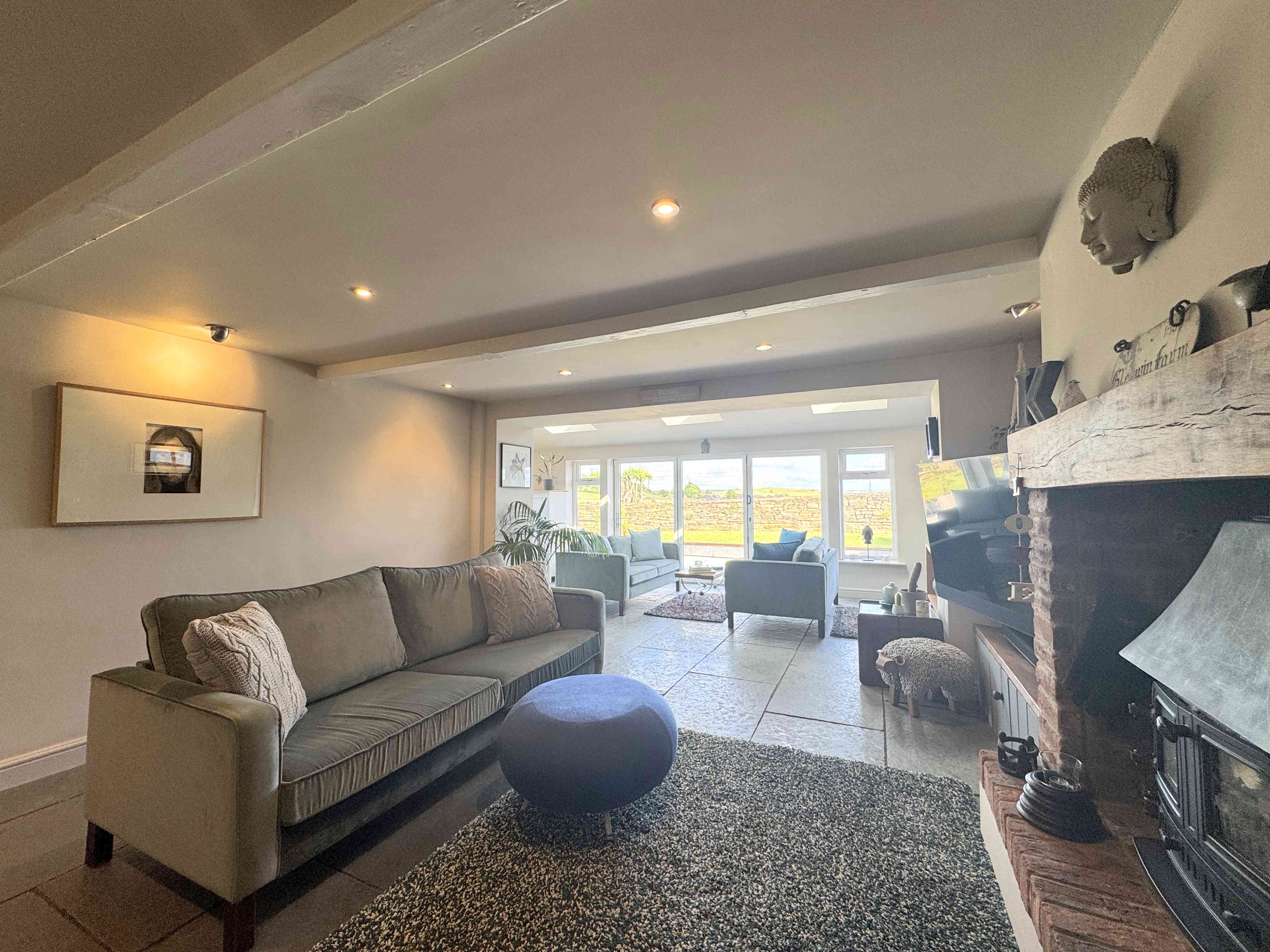 Bright and welcoming, the summer room features matching stone flooring with the lounge, UPVC bifold doors and windows offering far reaching views, Velux windows, modern tall radiator, natural tumbled grey limestone tiles and decorative wall panelling. It creates a perfect connection between indoor and outdoor living spaces.