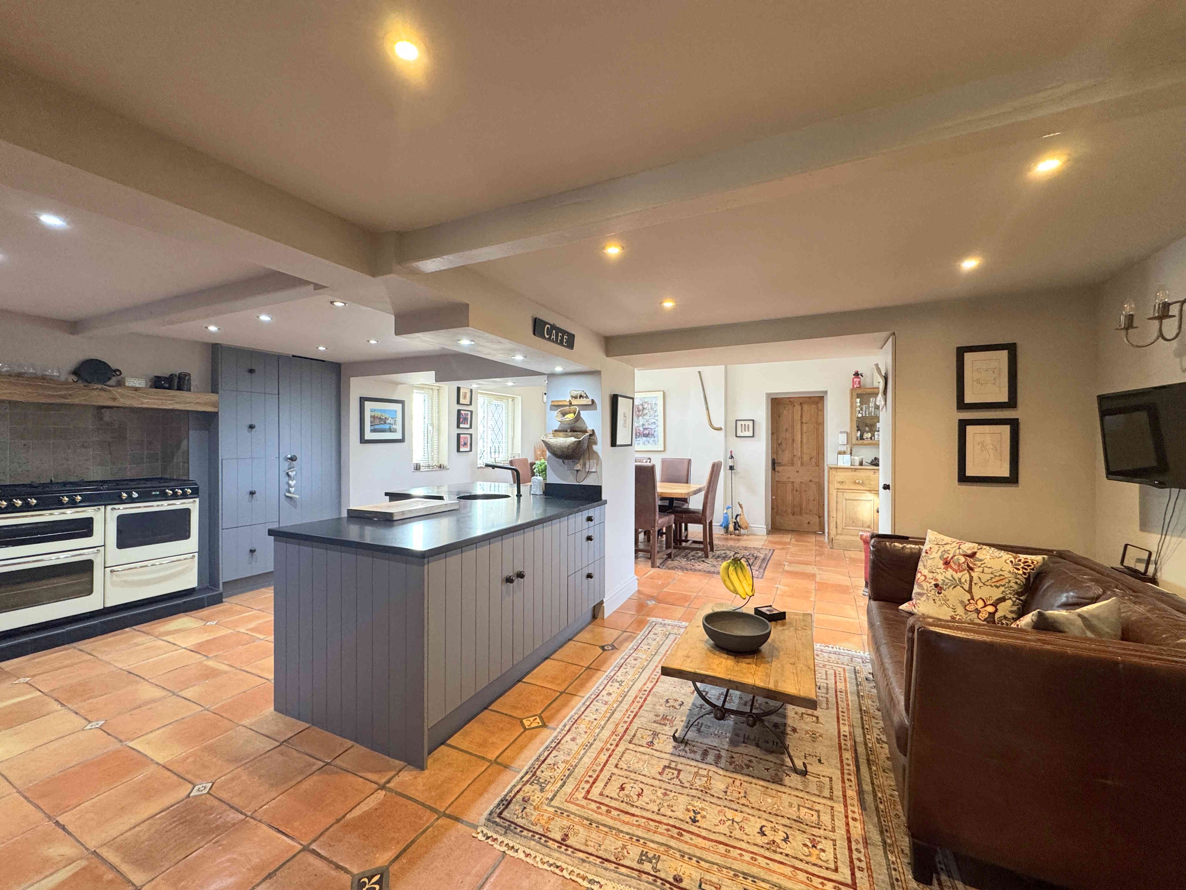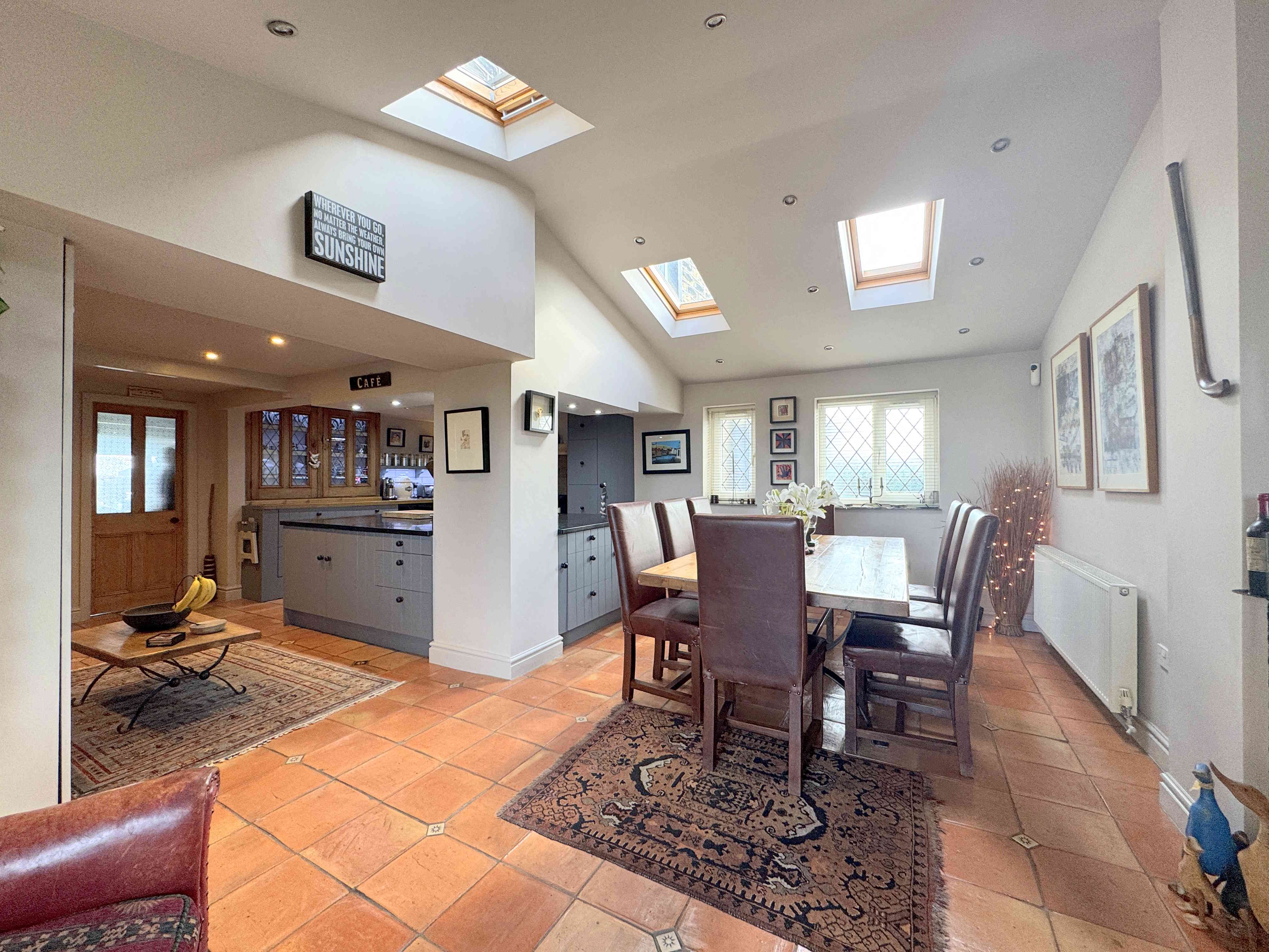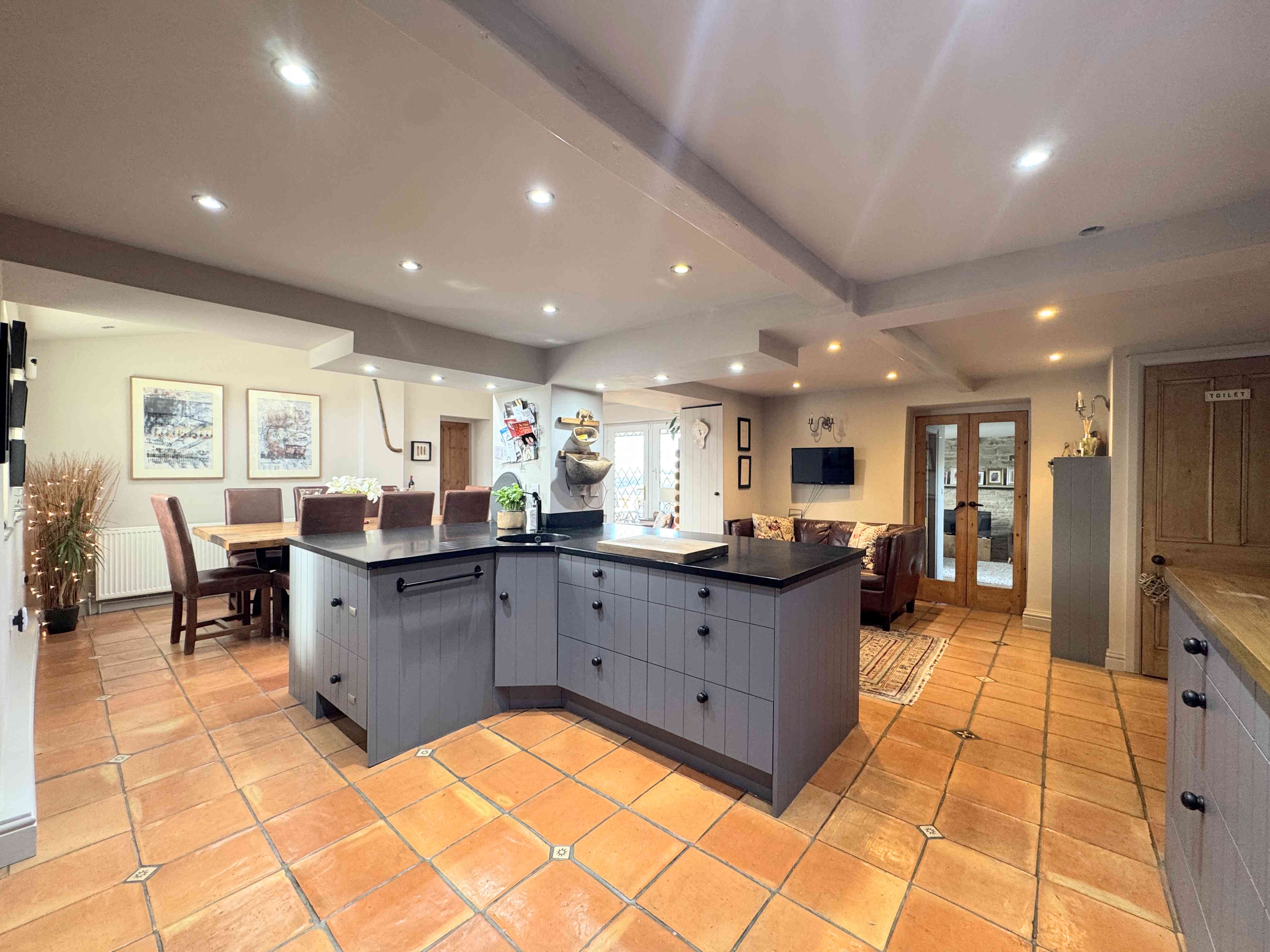 A spacious open-plan dining room seamlessly connected to the living kitchen. It features a UPVC front door and windows, Velux windows, handmade Spanish terracotta tiled flooring, ceiling spotlights, and radiators. There is internal access to the attached garage, enhancing convenience and functionality.