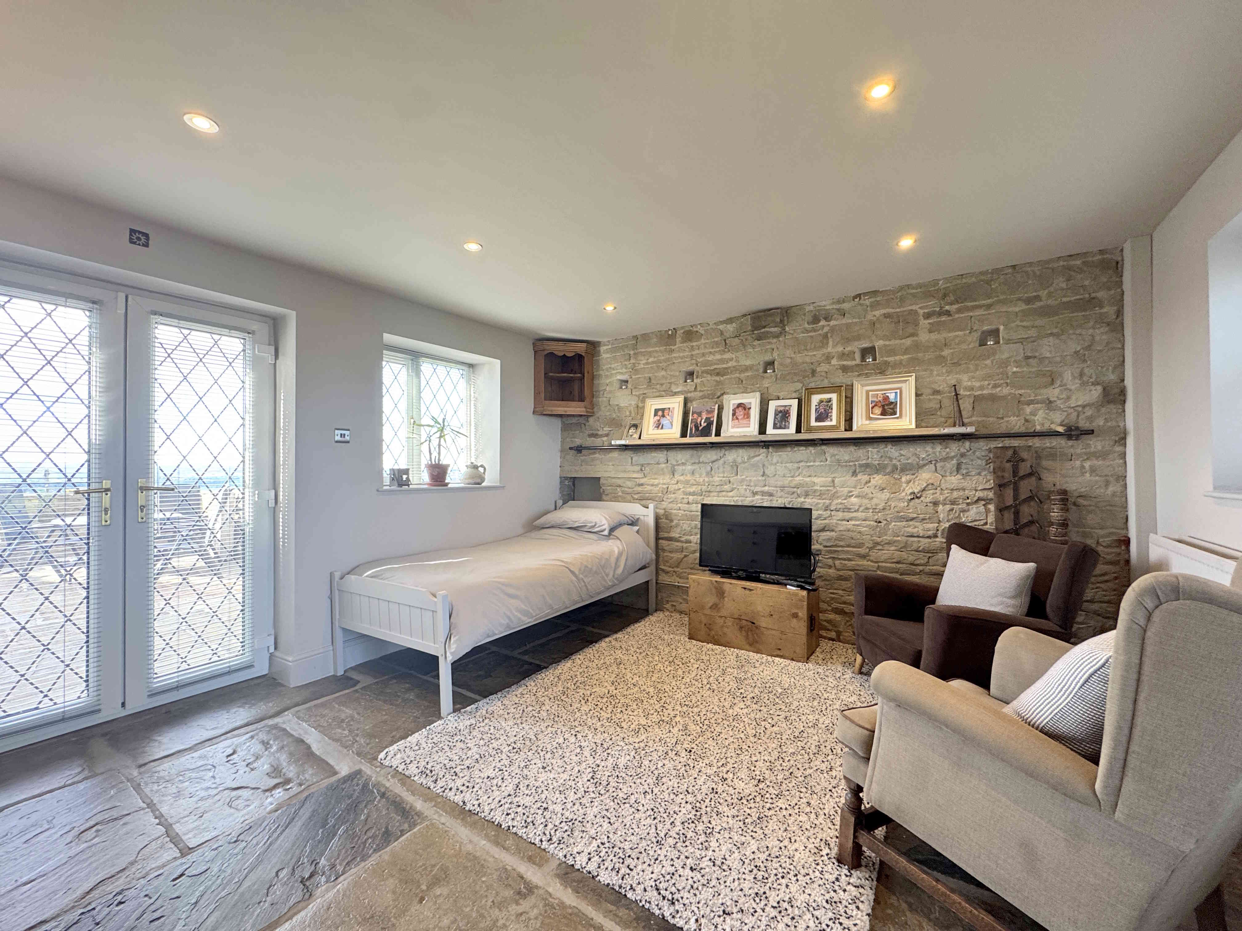 This versatile space is ideal for use as an Airbnb or guest accommodation. It features a double bedroom with beautiful Yorkshire stone flooring, an exposed stone feature wall, and two double fitted wardrobes. A fitted kitchenette includes wall and base units, a sink with chrome mixer tap, microwave, induction hob, and integrated fridge. Two sets of UPVC patio doors lead to both the front and rear gardens. To complete this room there are UPVC windows and a radiator.