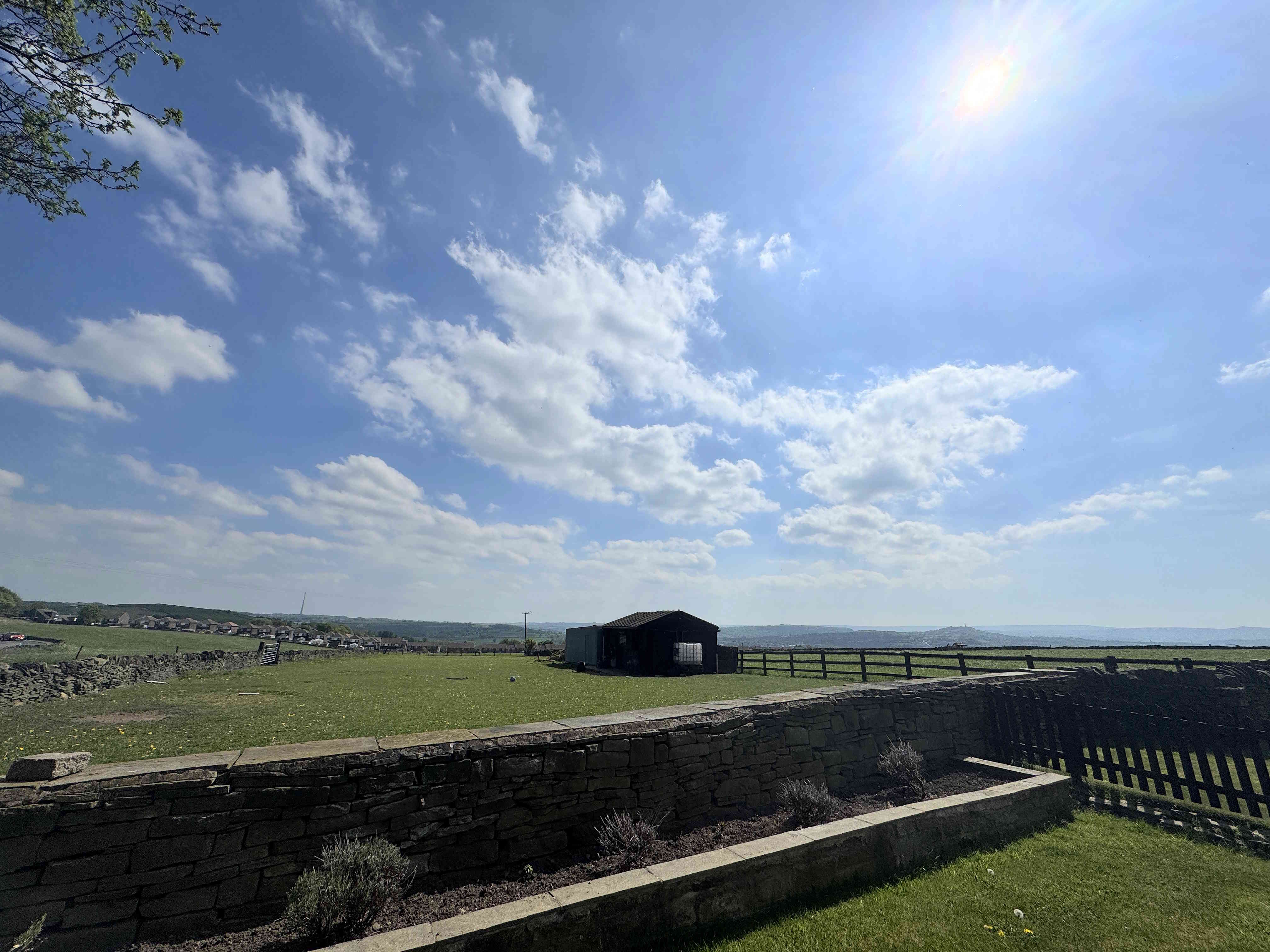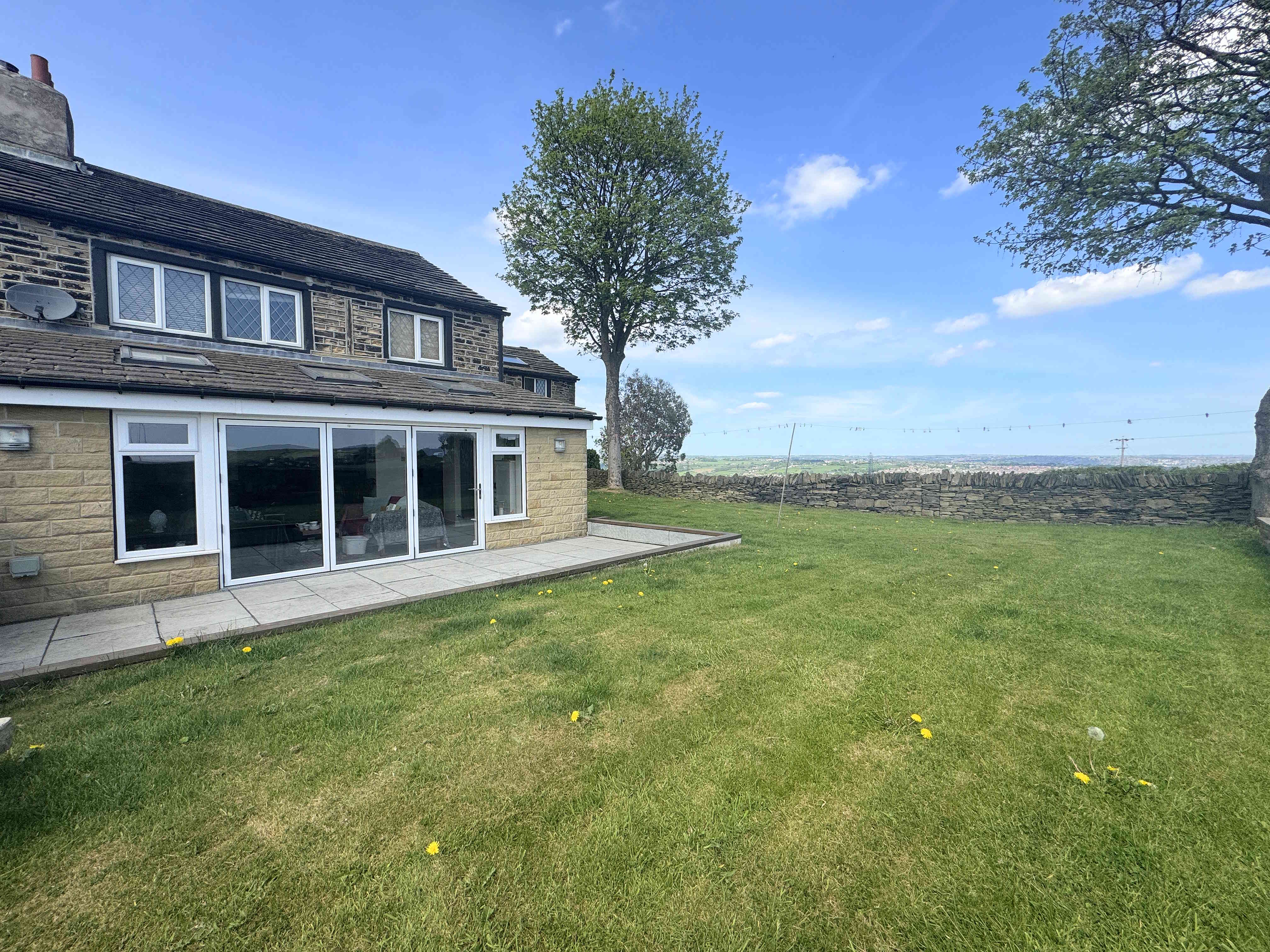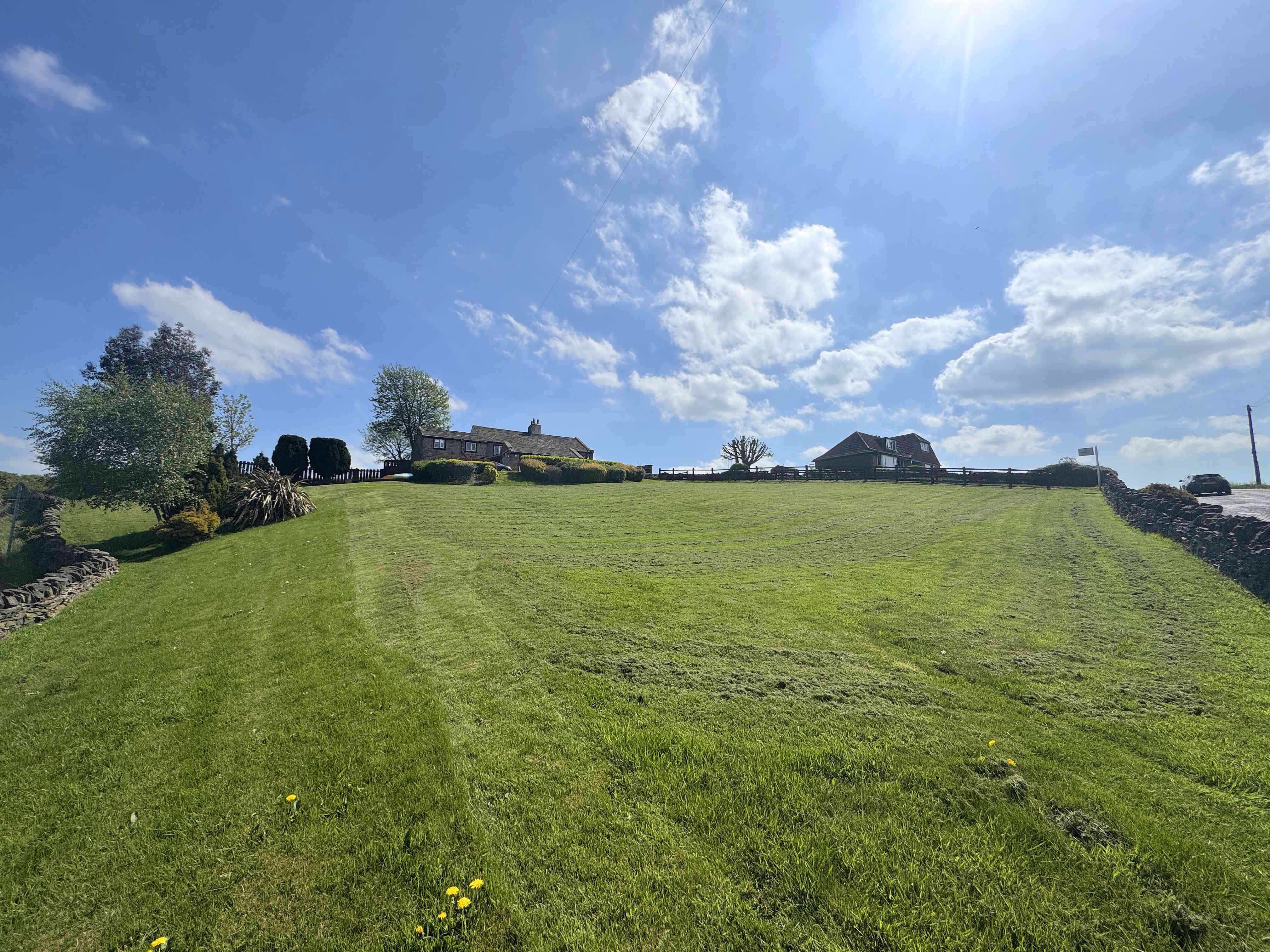 The property is approached via a shared driveway leading to a private drive with space for multiple vehicles. To the front is an enclosed patio area with far-reaching views. The rear of the property offers an enclosed garden with lawn and a flagstone patio area, enjoying uninterrupted panoramic views including Emley Moor and Castle Hill. Additionally, the property benefits from approximately 1.25 acres of surrounding land, offering exceptional outdoor potential.
