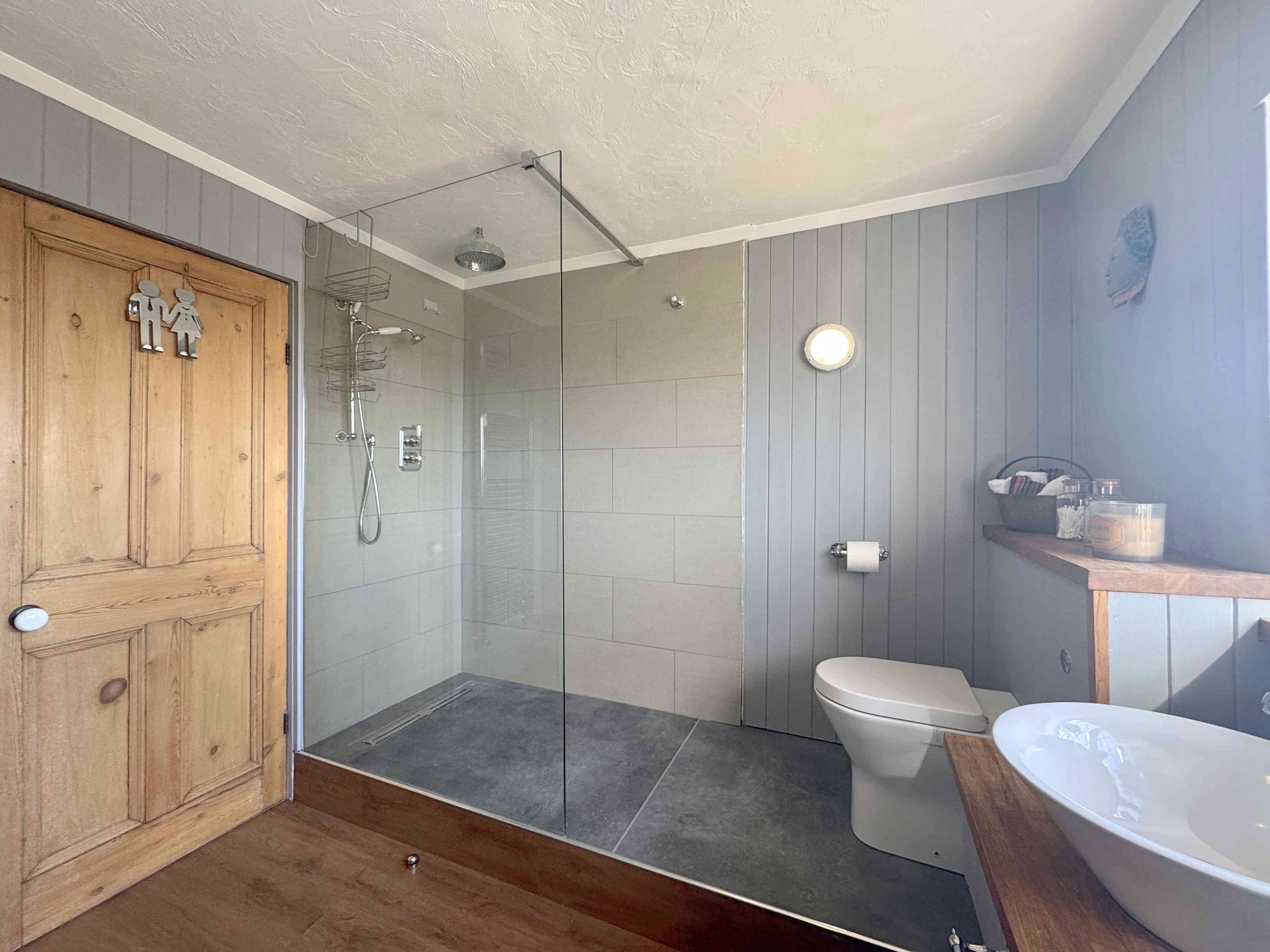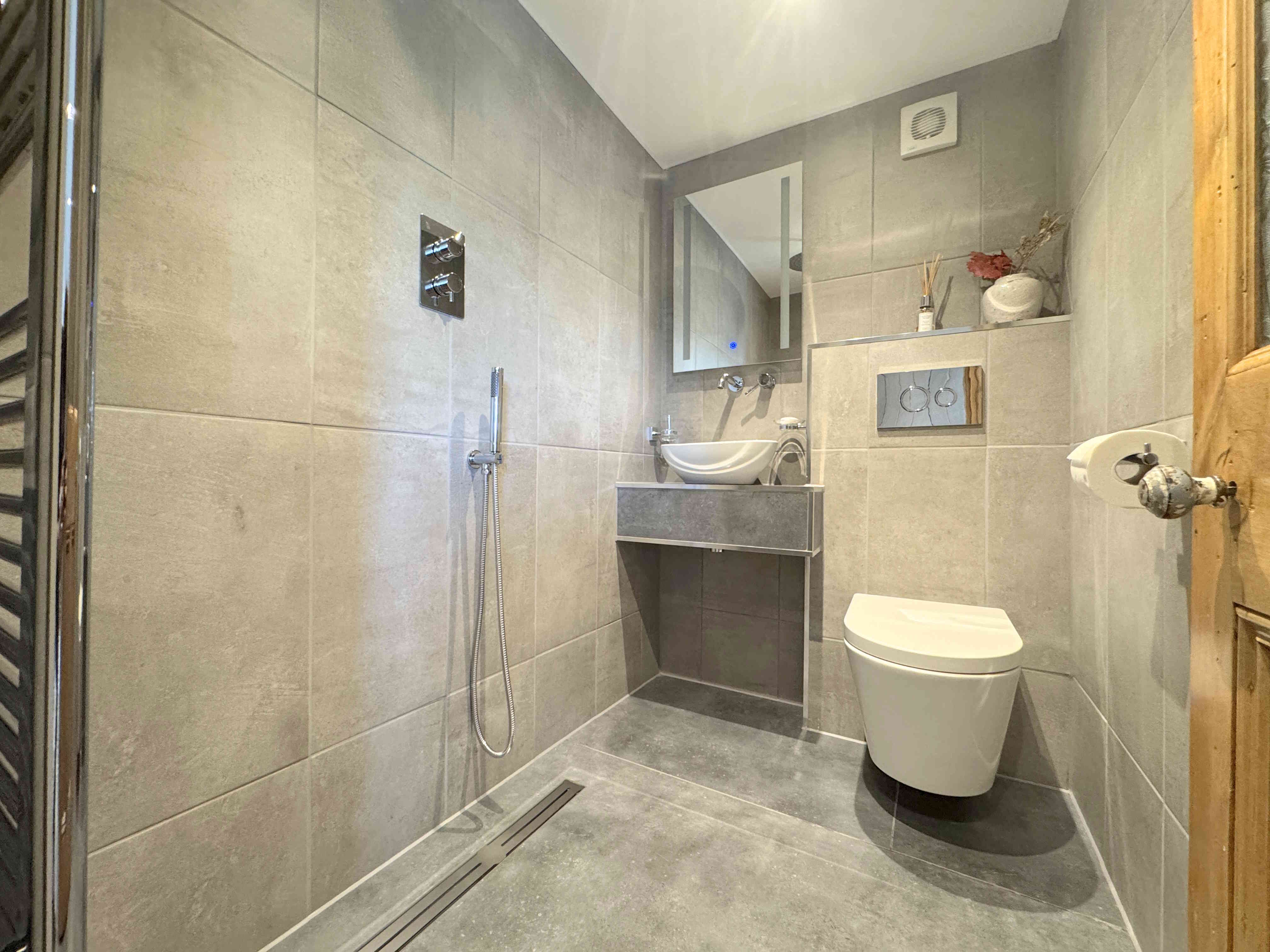 A stylish wet-room style ensuite comprising a rainfall and handheld shower, low flush toilet, and hand wash basin. Finished with fully natural slate tiled walls and floor, ceiling spotlights, and a chrome towel radiator.