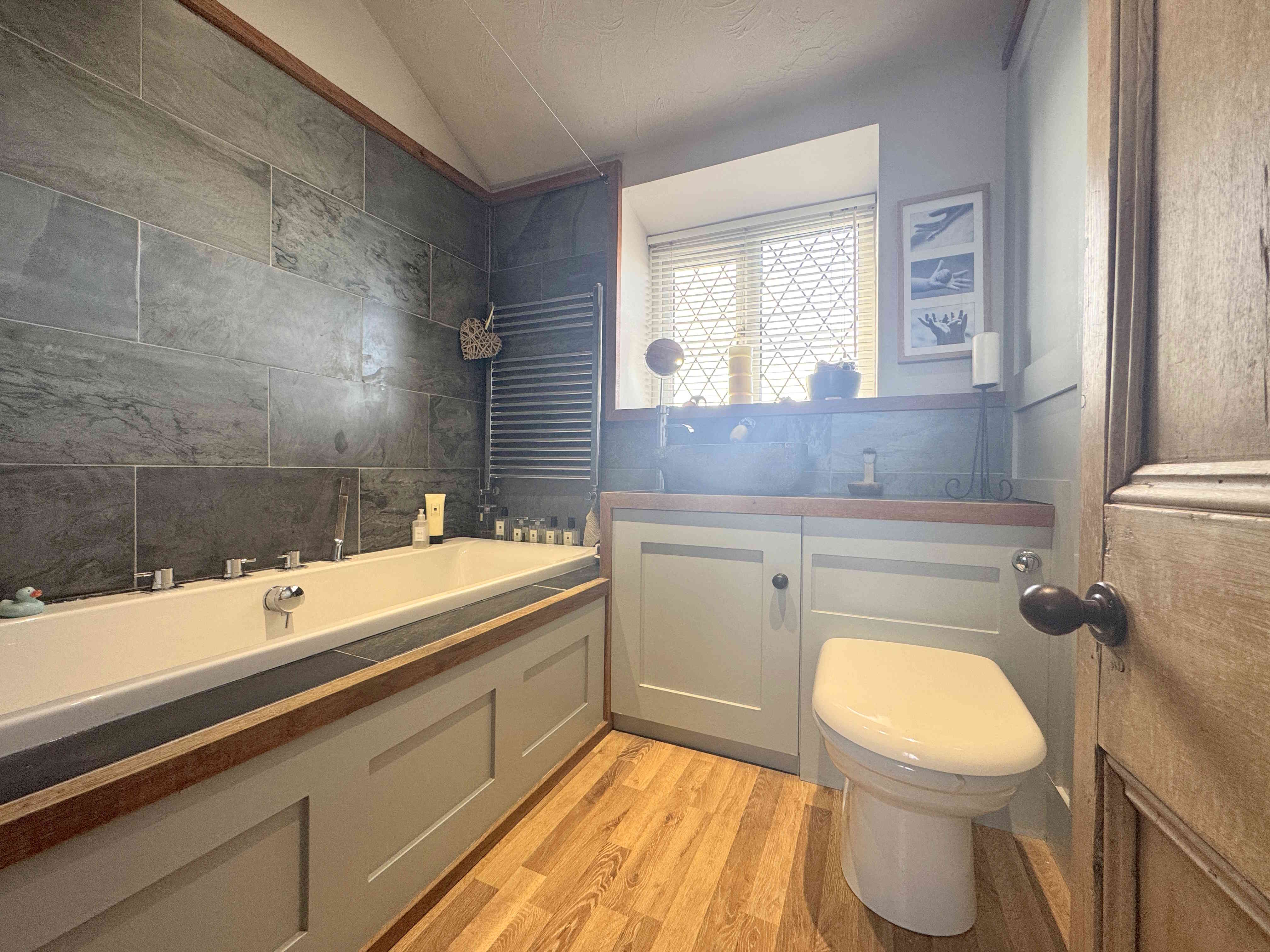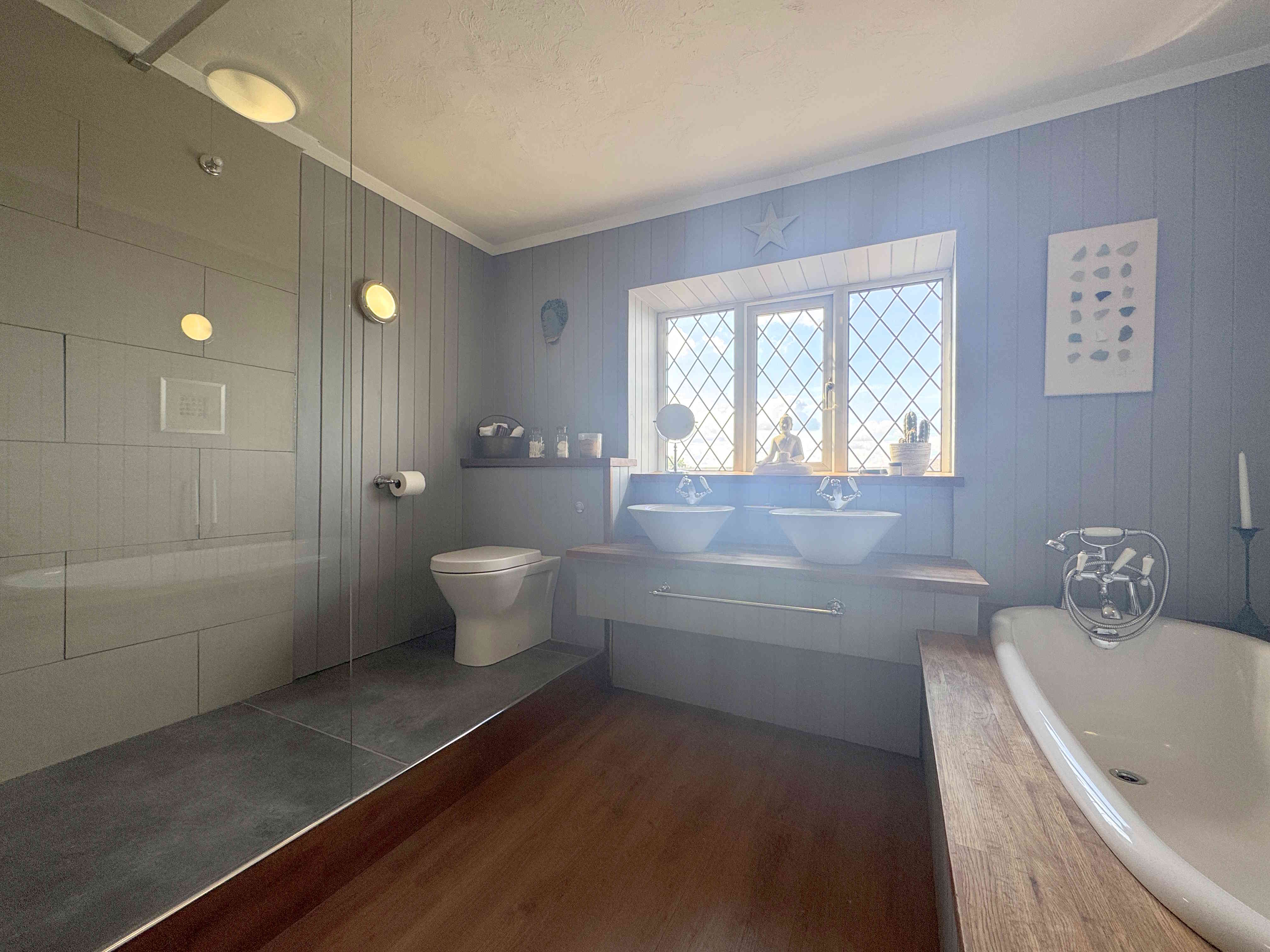 A stylish four-piece bathroom suite featuring a bathtub, a tiled walk-in shower cubicle with a glass screen, rainfall and handheld shower fittings, a low-flush toilet, and a dual hand wash basin. Additional features include a built-in storage cupboard, wood-effect laminate flooring and a uPVC window offering far-reaching views.