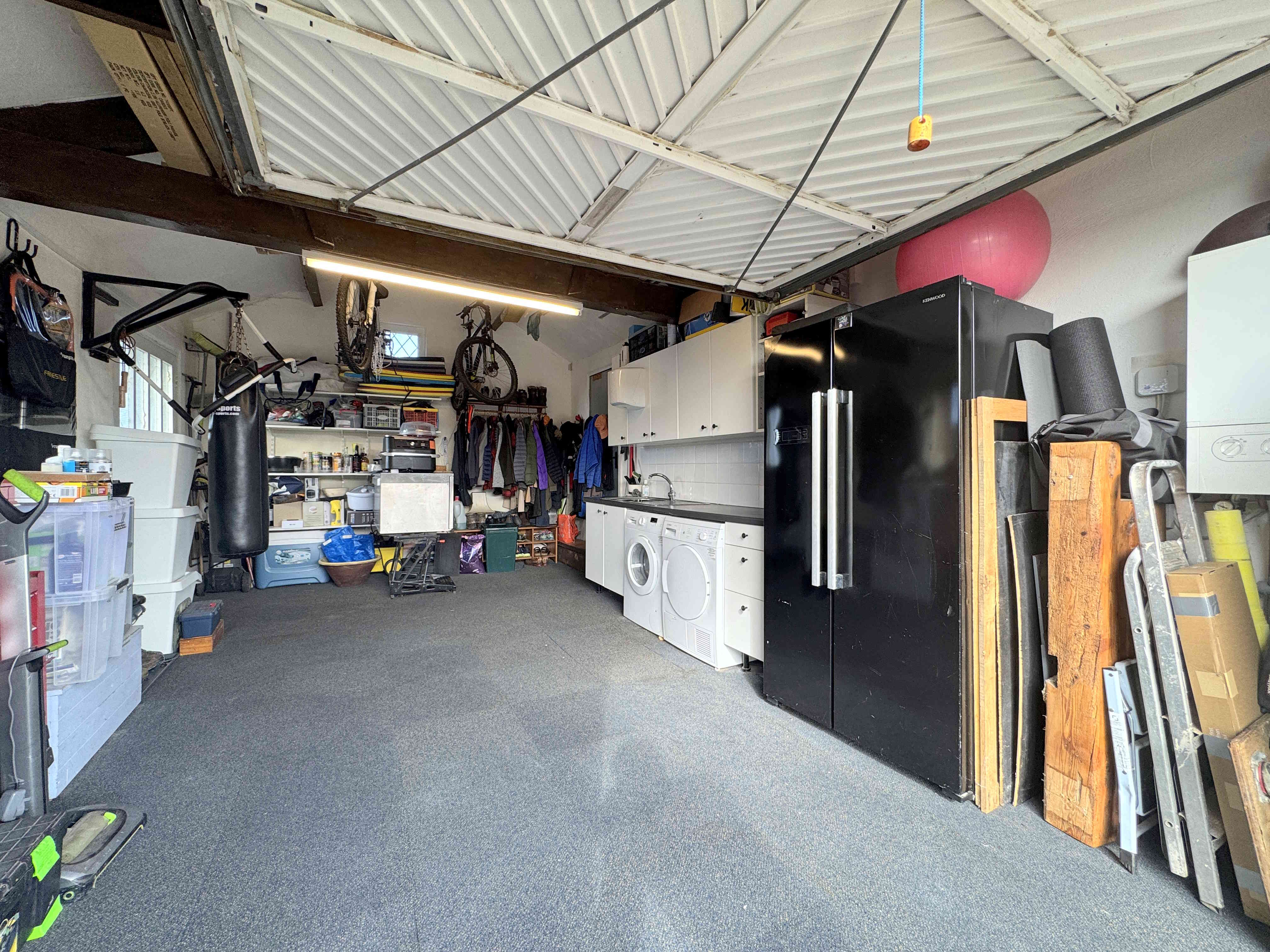 A large, attached garage with an up-and-over door. It includes fitted wall and base units with a sink and chrome mixer tap, splashback tiling, and space and plumbing for a washing machine and dryer. The garage houses the combination boiler, offers roof storage, and provides both external access to the drive and secure internal access to the dining room. UPVC windows, power, and lighting complete the space.