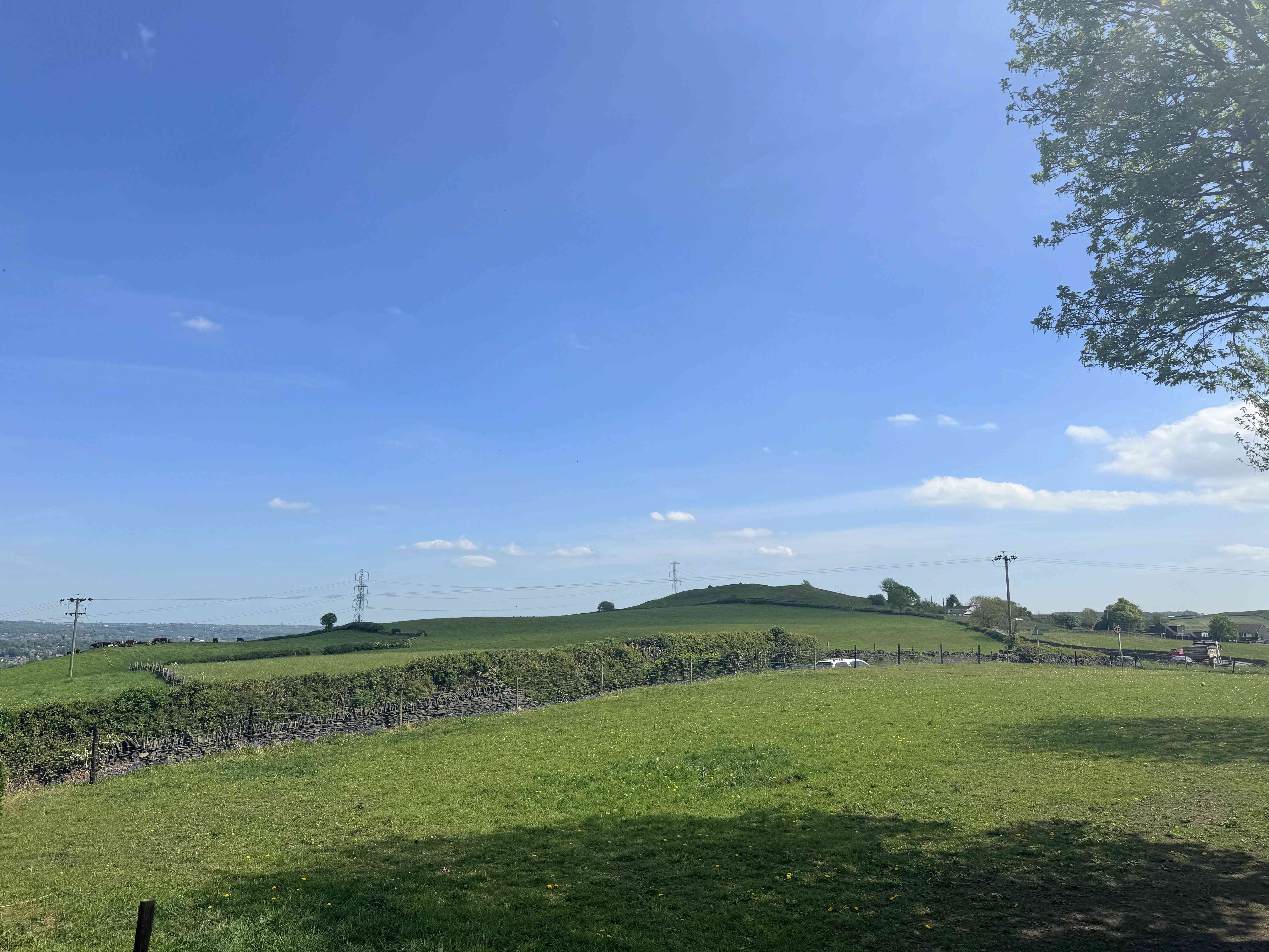 A double bedroom with fitted wardrobes, radiator, and UPVC window boasting views over the surrounding landscape, including Emley Moor mast.
