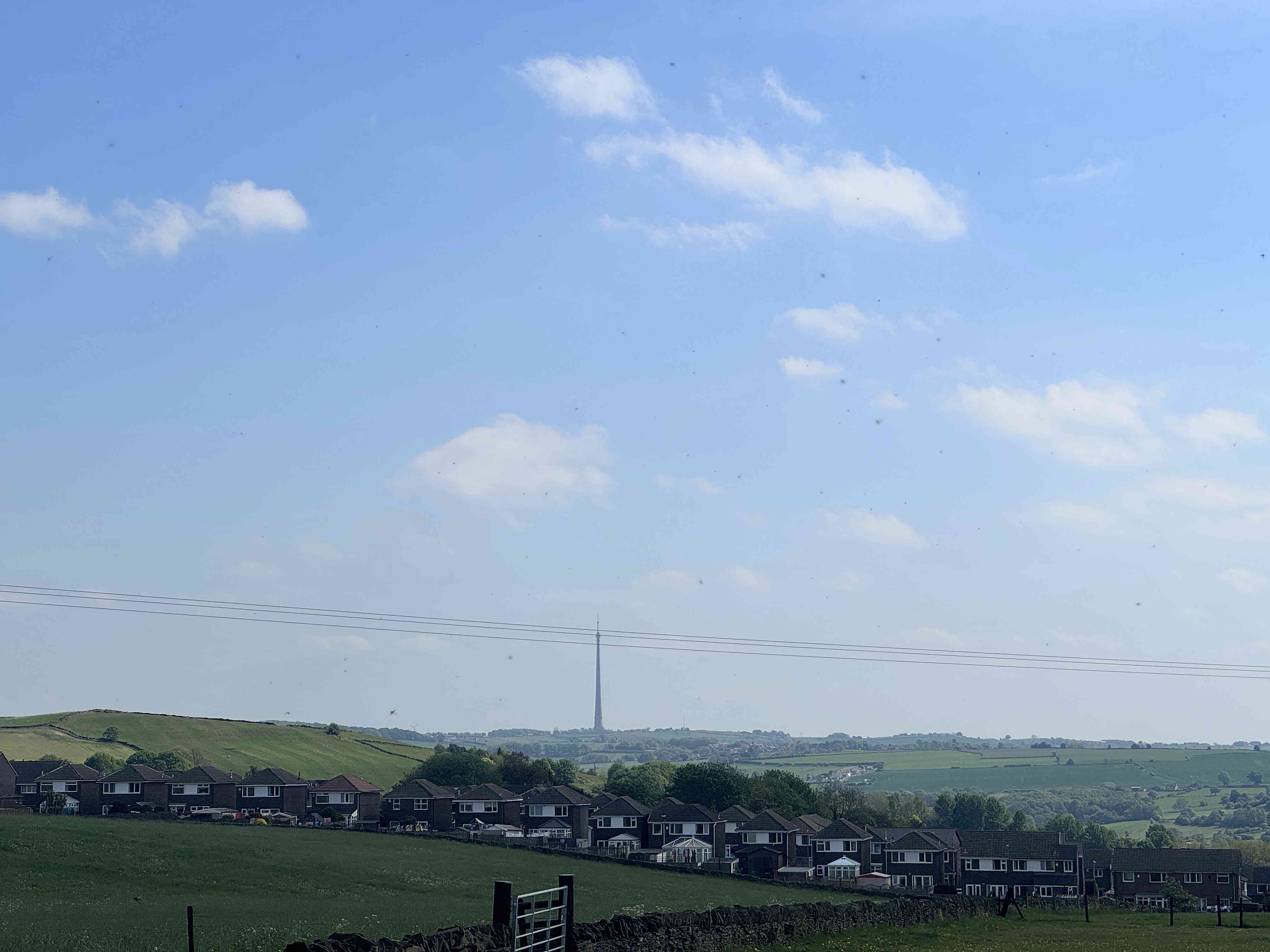 A large double bedroom with full-length fitted wardrobes with sliding doors, and UPVC mullion window offers expansive views including Emley Moor mast.
