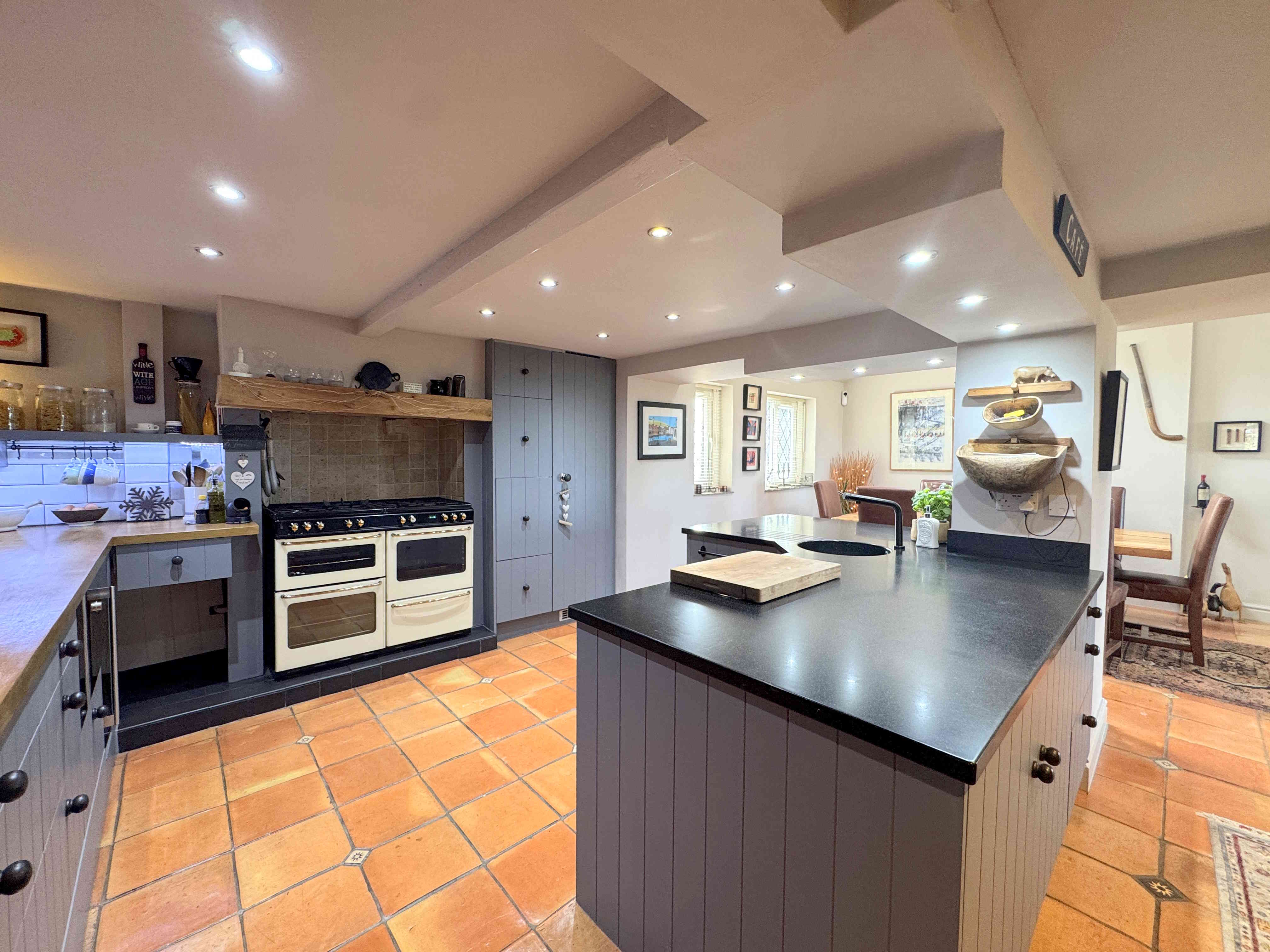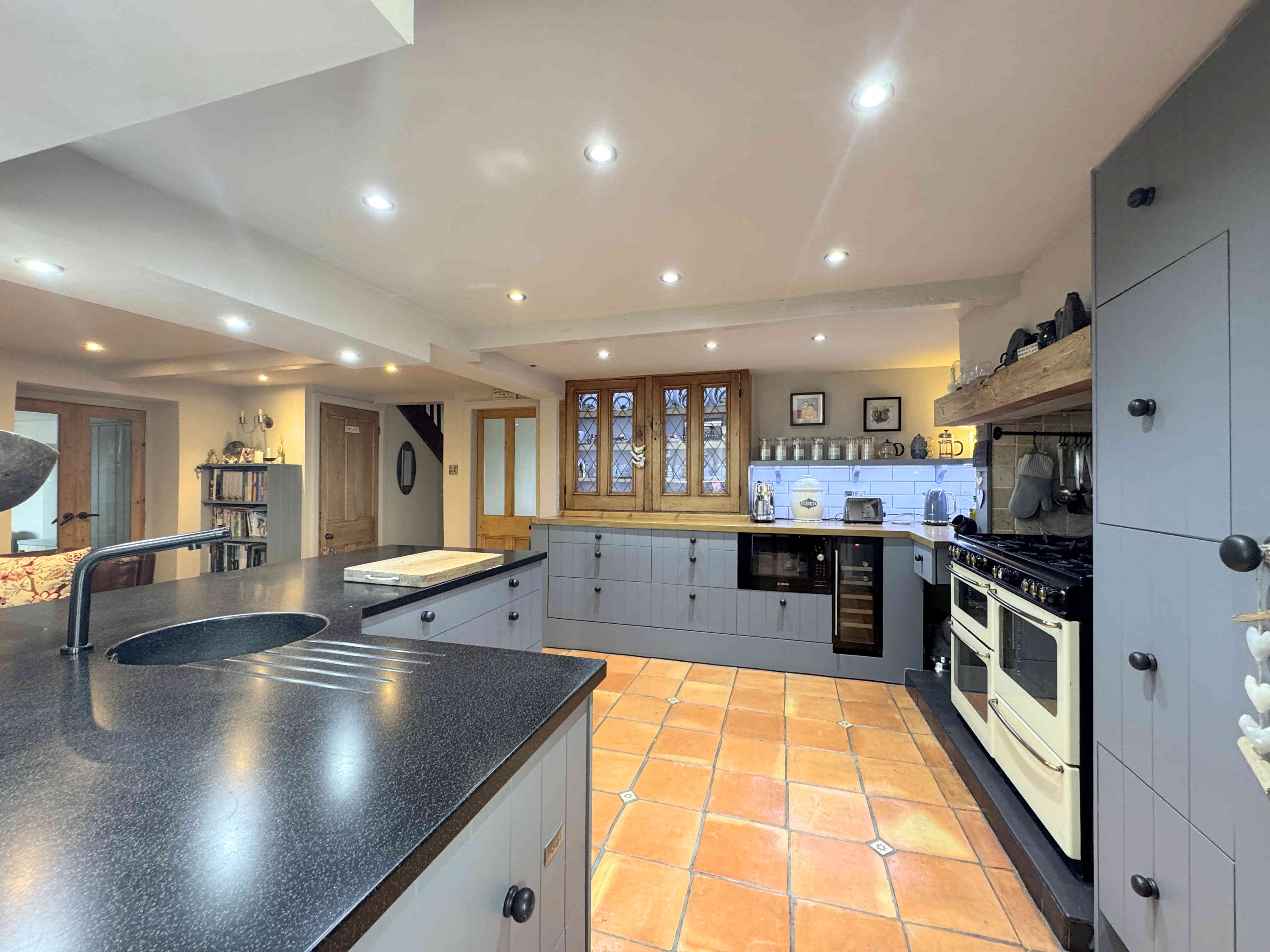 This well-appointed kitchen includes a wide range of wall and base units, complete with a sink and mixer tap. Appliances comprise an integrated fridge freezer alongside a built-in dishwasher, microwave, wine cooler, and a Stoves cooker with extractor fan. The handmade Spanish terracotta tiled floor continues from the dining area, complemented by ceiling beams, a radiator, and ceiling spotlights.