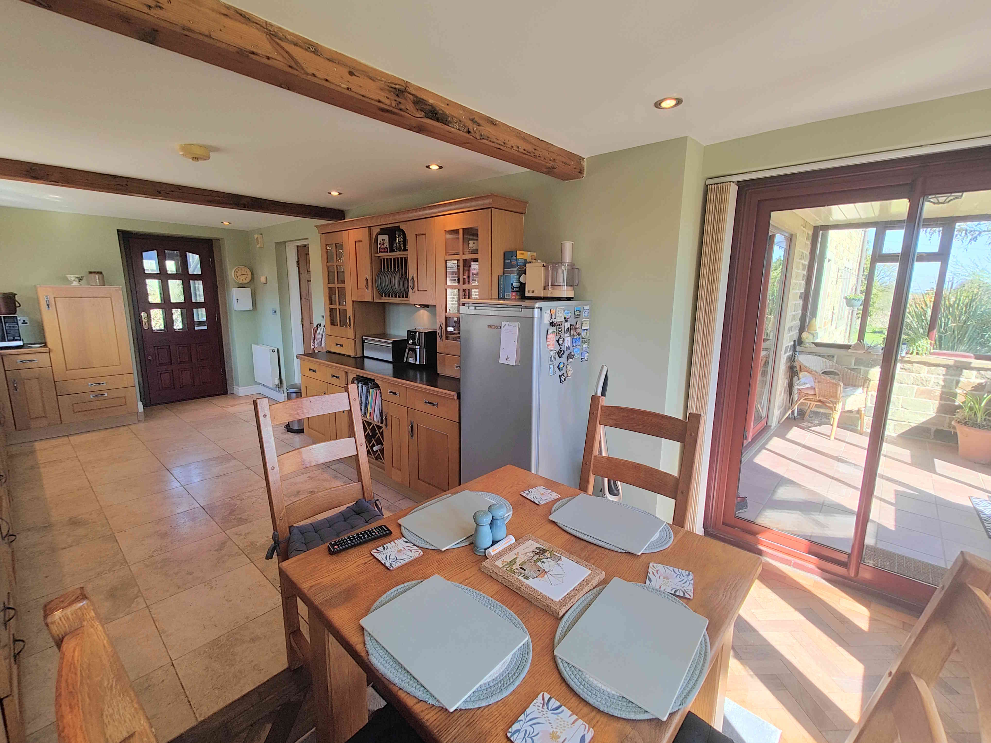 The kitchen area has laminated work surfaces to three walls all with over or under counter cupboards and drawers presenting ample storage space. With an integrated hob, stainless steel extractor hood, integrated dual oven, ceiling inset spotlights, integrated dishwasher, beamed ceiling, fitted fridge, splashback tiling, tiled floor, double radiator, single radiator and a stainless steel 1 ½ sink with stainless steel mixer tap.