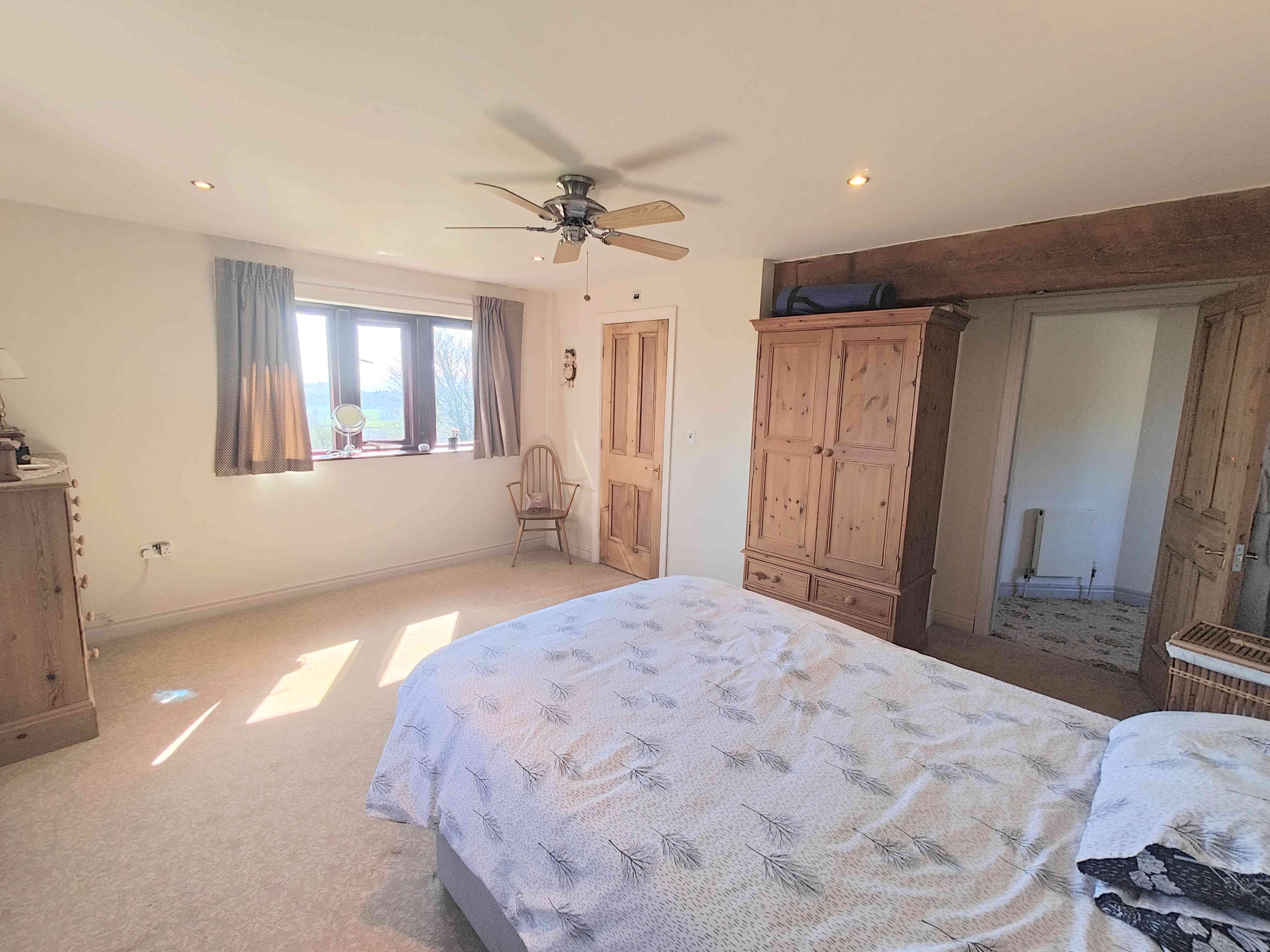 A large master bedroom that presents ample space for a double bed along with additional bedroom furniture. The bedroom features a large walk-in-wardrobe style cupboard to one side of the room. A double-glazed window, to the front elevation, provides plenty of natural light. With a carpeted floor, ceiling inset spotlights, central ceiling fan, beamed ceiling and double radiator.