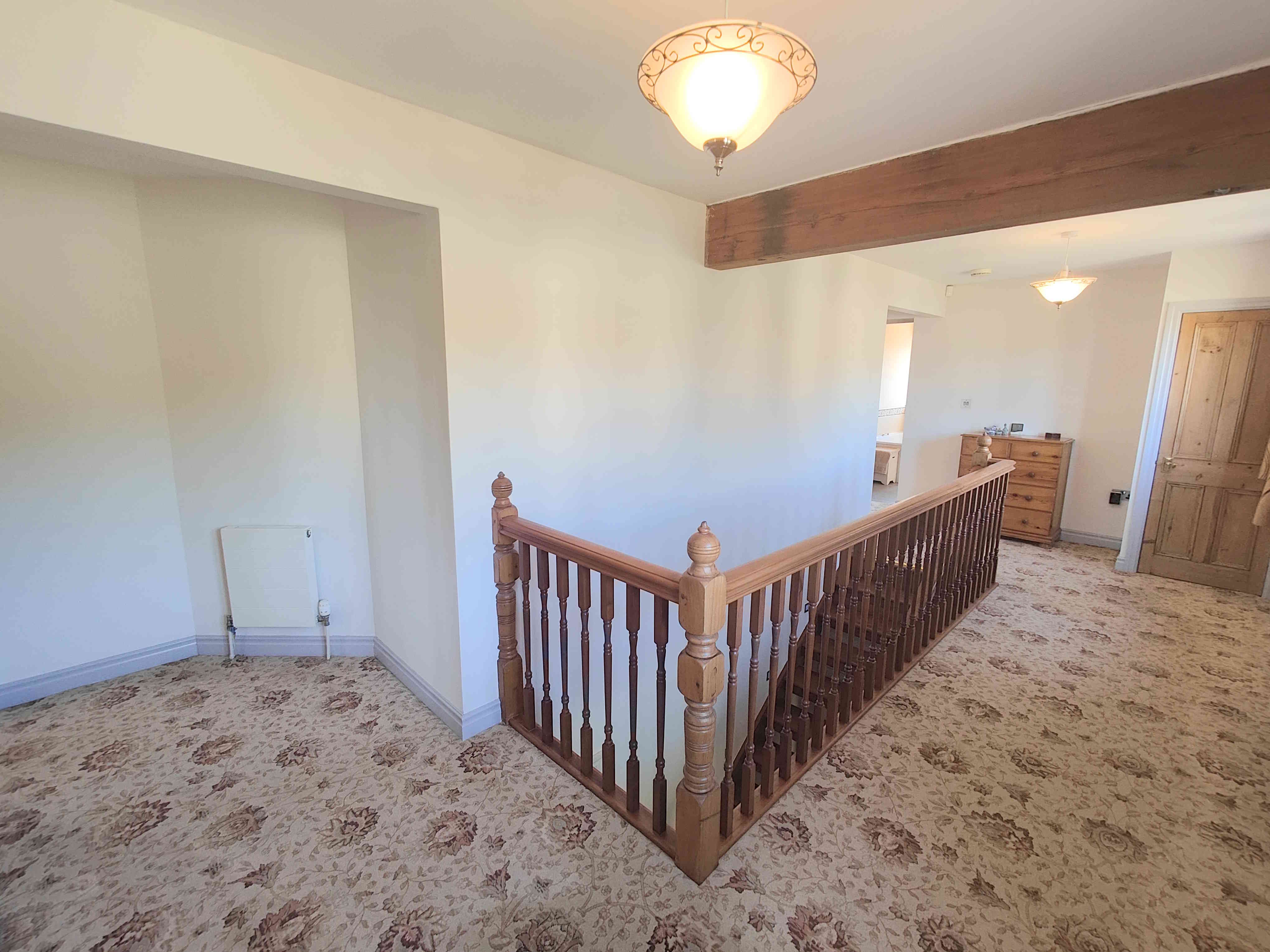 An open and very spacious landing that offers plenty of space throughout the first floor of the property. With a carpeted floor, two double glazed windows, two central light fittings, corner airing cupboard, radiator and beamed ceiling.