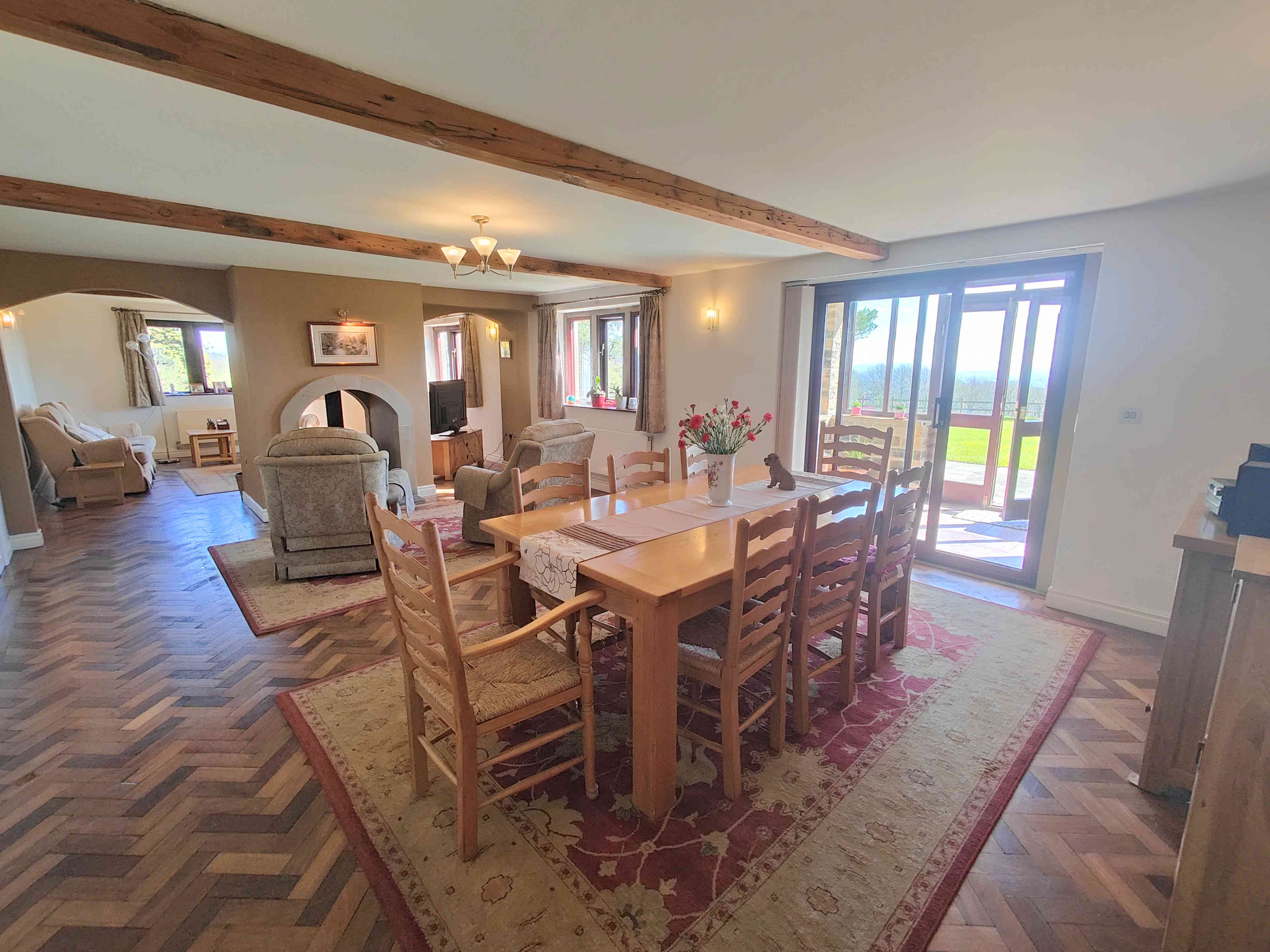 A rather large and open area, offering ample space for a very large dining table, further seating space and additional furniture. An ideal place for family dinners or entertaining. The dining room also benefits from the open fireplace with a view of the wood burning stove creating a charming feature as well as a secondary heat source. With a beamed ceiling, central light fitting, wall mounted light fittings, double radiator and solid Parquet herringbone wood flooring.