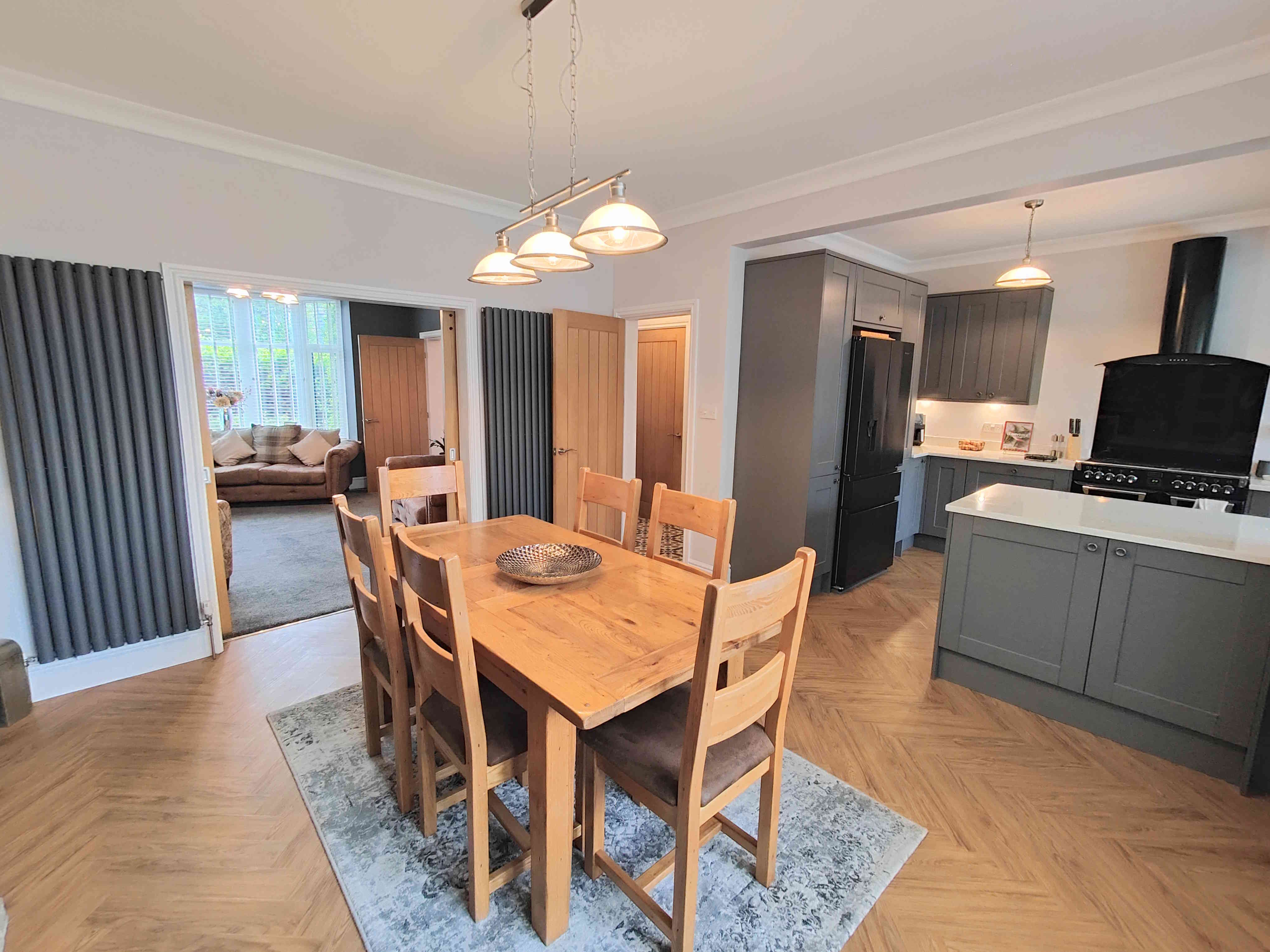 An impressive open plan dining kitchen that creates a fantastic space that has two distinct areas.  The dining area is large and impressive with more than ample room for a large family dining table along with additional furniture.  The dining area is again bathed in natural light owing to a large uPVC double glazed bay window, featuring a curved window seat, overlooking the garden to the rear elevation.  A large wood burning stove, again sat on a stone hearth and with railway sleeper mantelpiece, creates a fantastic central feature.  With high quality parquet, central light fitting, cornice to ceiling and two modern style vertical radiators.